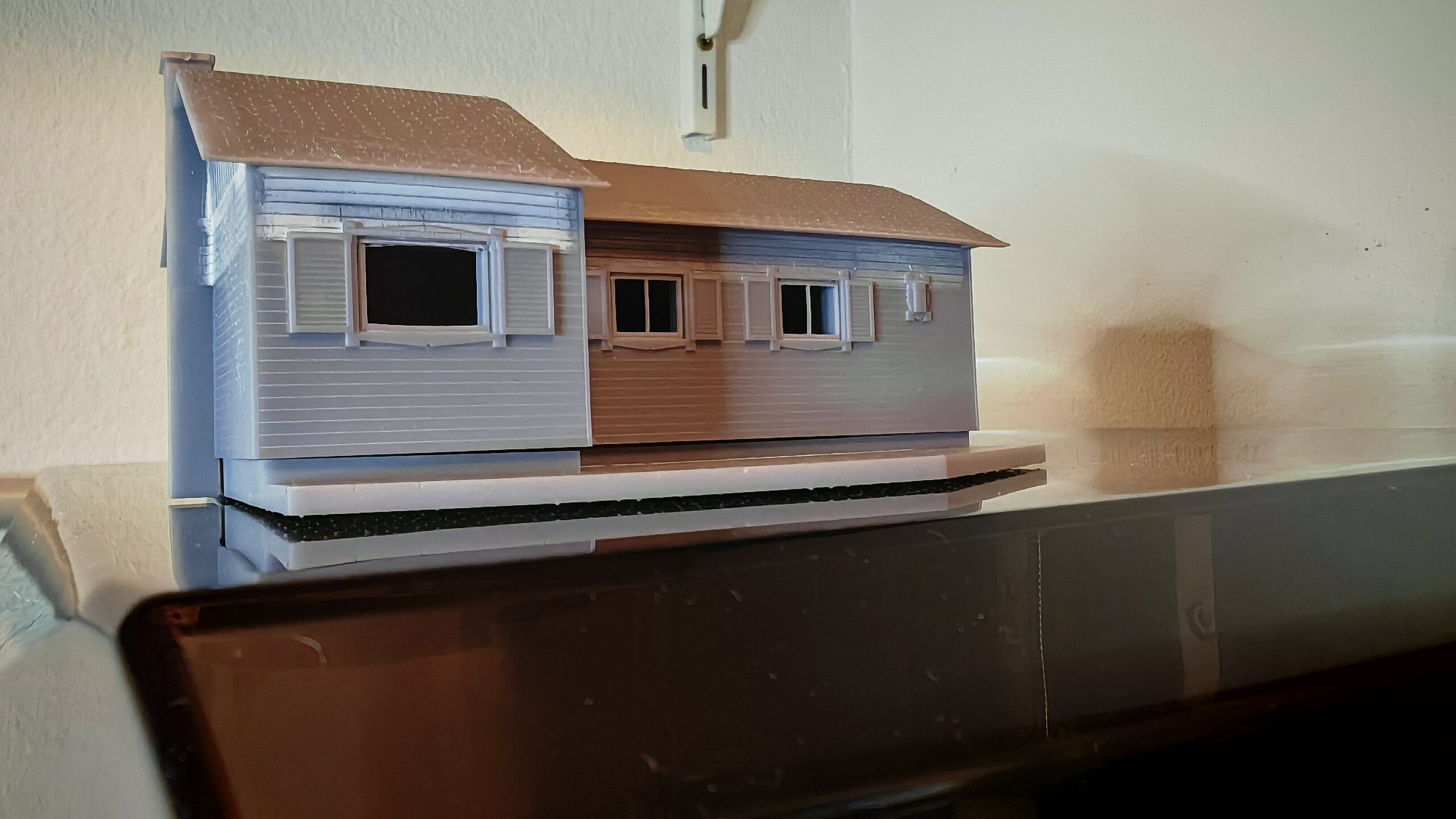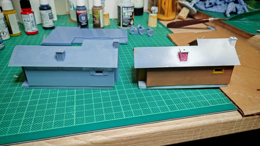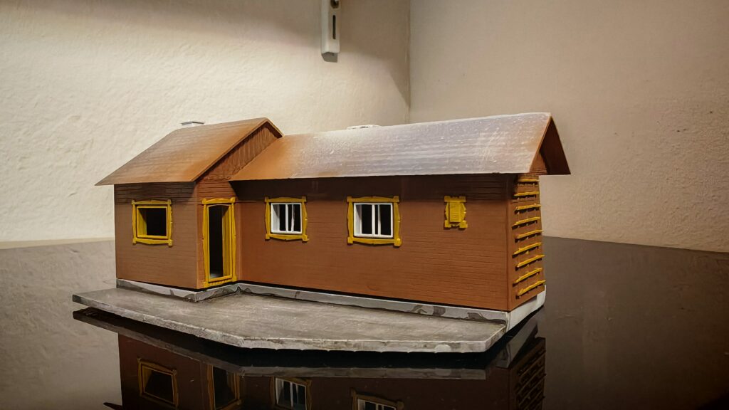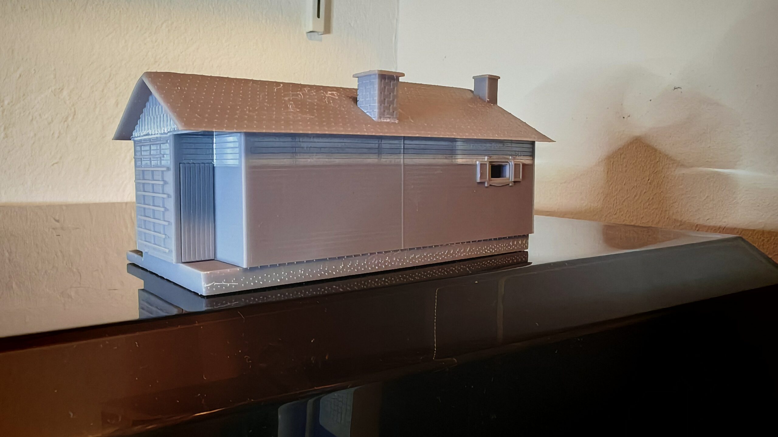 Weil das Ergebnis einfach nicht zufriedenstellend war, andere Drucke ebenfalls nicht funkionierten habe ich mich auf die Fehlersuche gemacht. Zum einen habe ich die Einstellungen des Druckers verbessert. dann habe ich mir eine Magnetplatte gegönnt. Die musste natürlich erst neu kalibriert werden. Was das Druckergebnis massiv steigerte. Dann habe ich die Fenster und Türen direkt in das Gebäude integriert. Ebenso die Fensteläden habe ich gleich mit dem Gebäude verbunden. Das Ergebnis ist durchaus zufriedenstellend.
