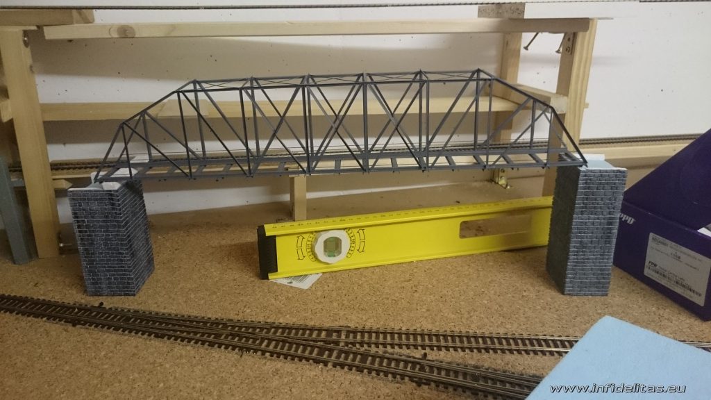 Der Bau dieses Abschnitts hat mir sehr viel Spass gemacht. Ich konnte wieder viele neue Verfahren ausprobieren und verbessern. Nach der Begrühnung hat die Brücke noch ein Facelift bekommen. Das ich leider nicht mit Bildern dokumentiert habe. Vielleicht reiche ich sie hier noch nach. Nach dem Einbau hat uns nicht gefallen das zu beiden Seiten der Geleise einfach nichts ist. In diesm Bereich werden Brücken oft mit Holz oder Metallplatten geschlossen um für mögliche Wartungsarbeiten Platz zu haben. Wir haben Dies mit Metallplatten gamacht in dem Wir Kartonstreichen (3Stück) grau eingfärbt haben und eingeklebt haben.