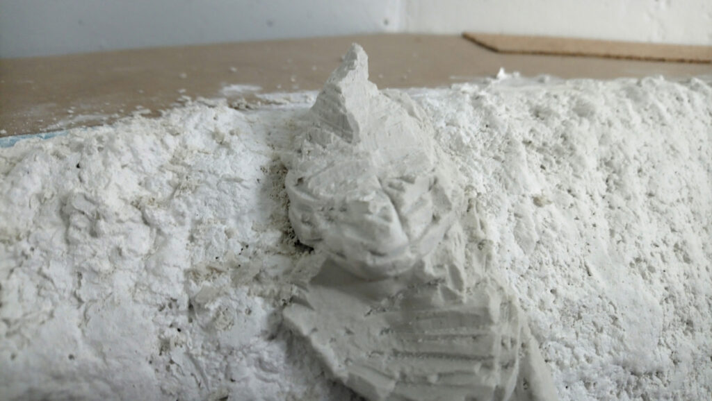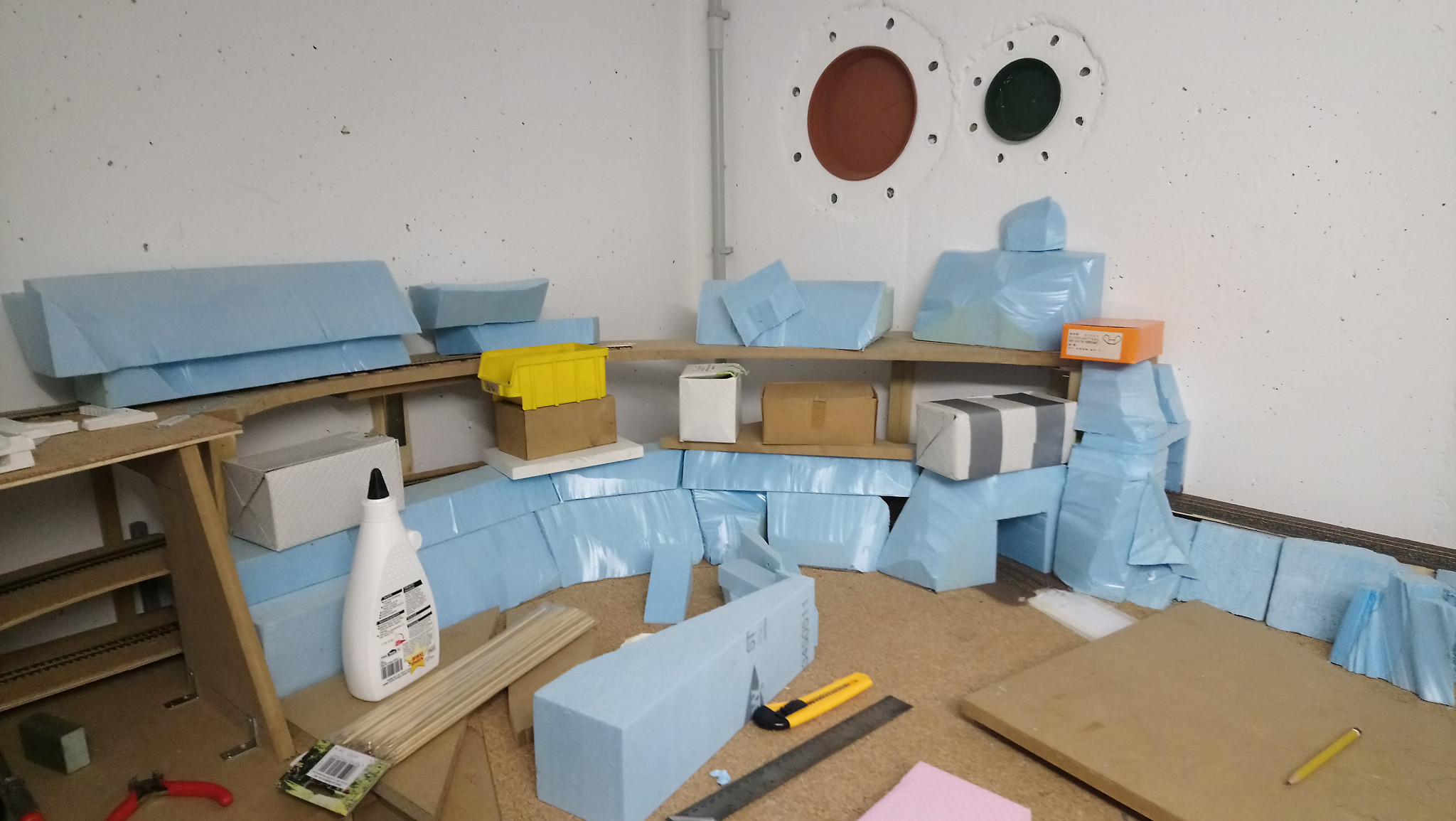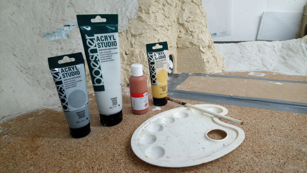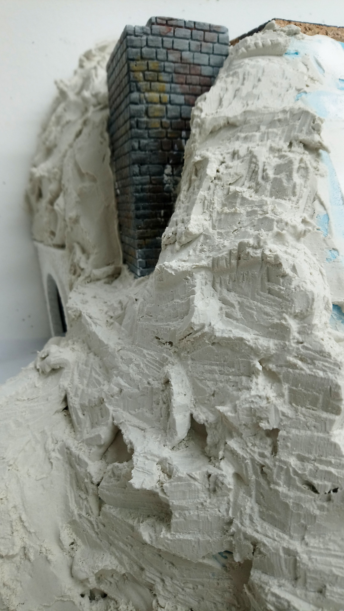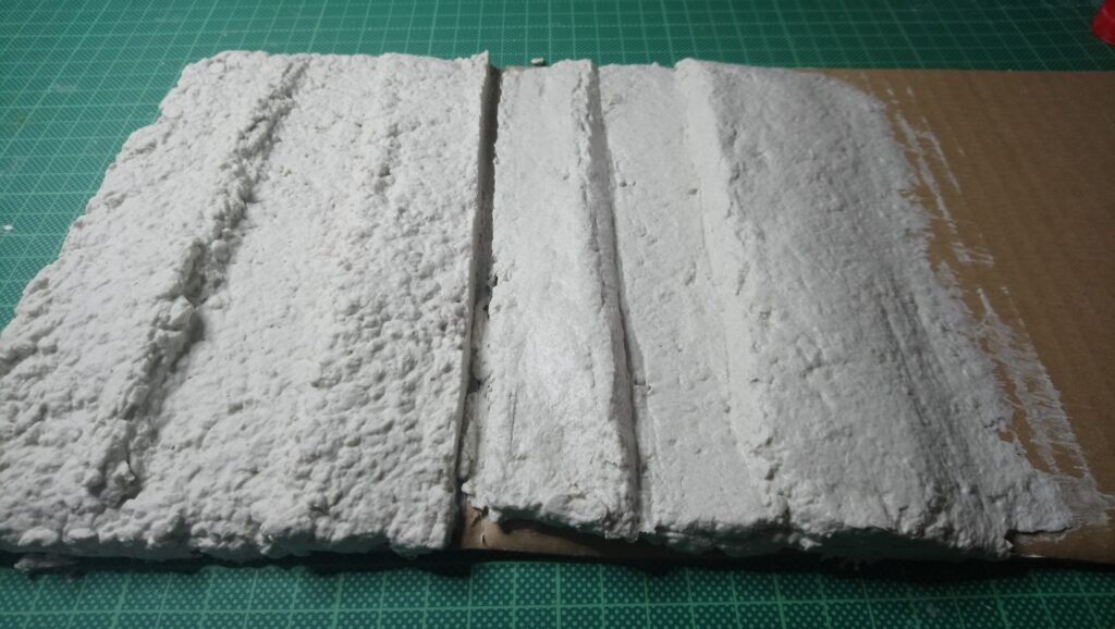Der restliche Styrodur wurde mit einem weiteren Experiment verkleidet um eine natürliche Landschaft zu bekommen. Dafür habe ich WC Papier geschräddert und zerfasert. Das wurde mit Gips und etwas Tapetenleim (trocken) vermischt. Diese Masse wurde mit Wasser vermengt und aufgetragen. Mit der Hand angeformt. Nach dem Aushärten ergab dies eine feste gut weiter zu bearbeitende Oberfläche. Durch den Leim läst sich die Masse sehr gut glatt streichen.