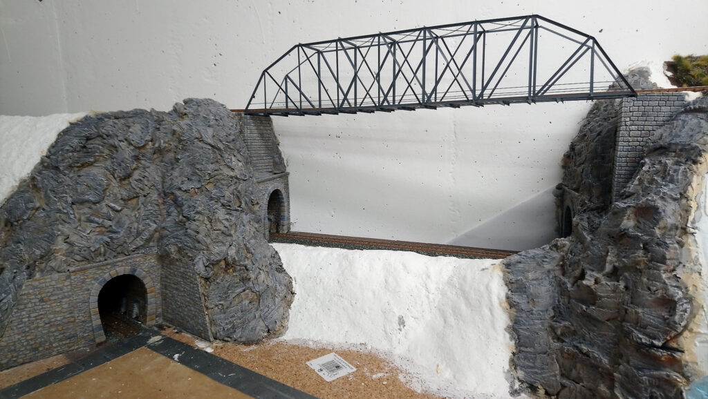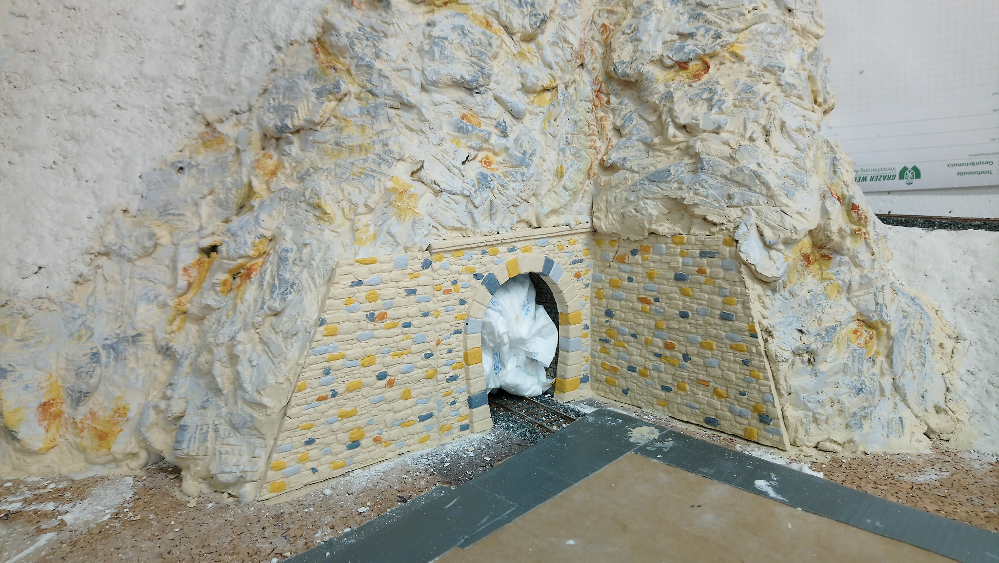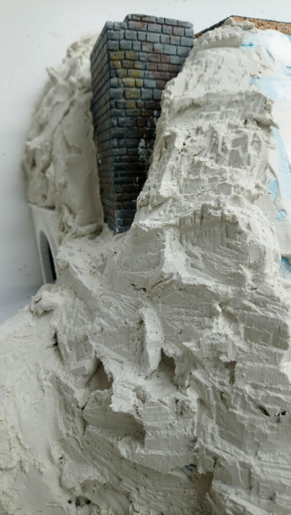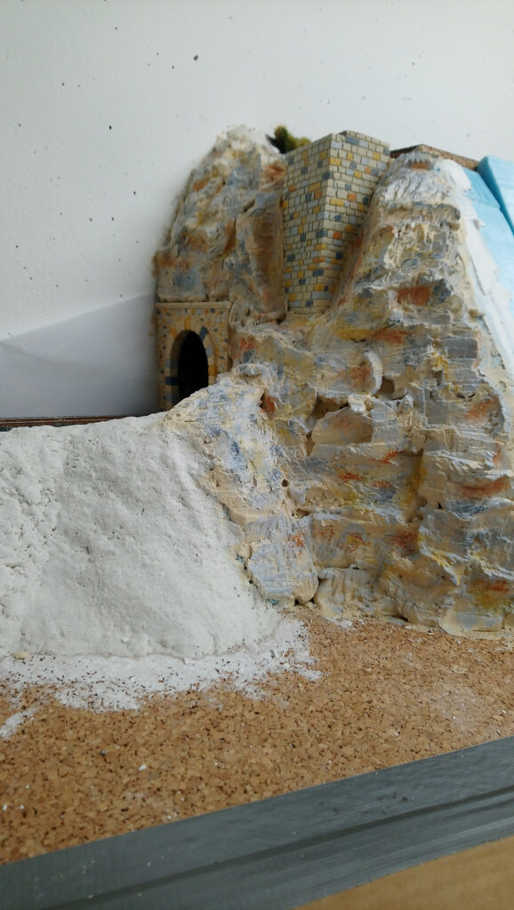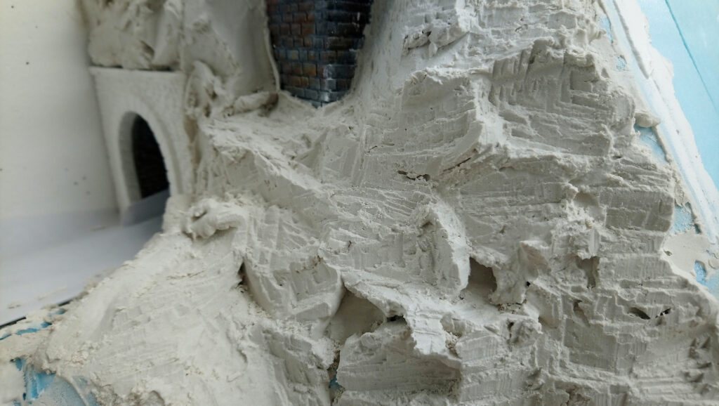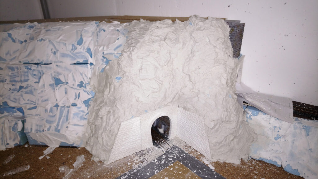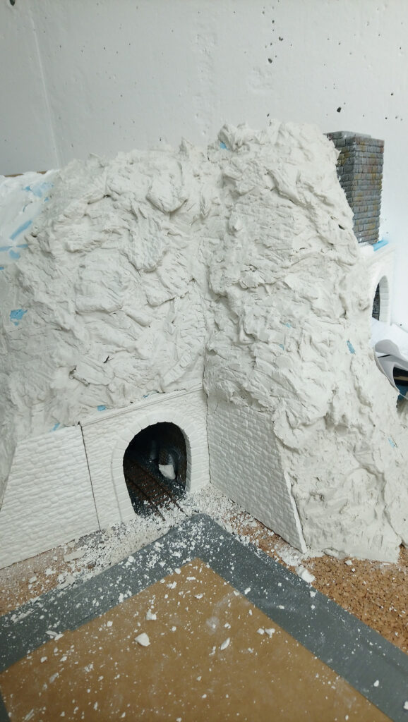 Nachdem alles gut duchgetrocknet ist, werden im nächsten Schritt noch Stützmauern und Tunnelportale eingebaut. Drei Portale, die ebenfalls aus Gips gemacht wurden haben wir direkt auf den Styrodur geklebt. Nach einer weiteren Trockenpause habe ich begonnen die Felsen mit Gips zu modellieren. Mit einem Stemmeisen habe ich die Struktur in den angezogenen aber noch nicht harten Gips geschnitten.