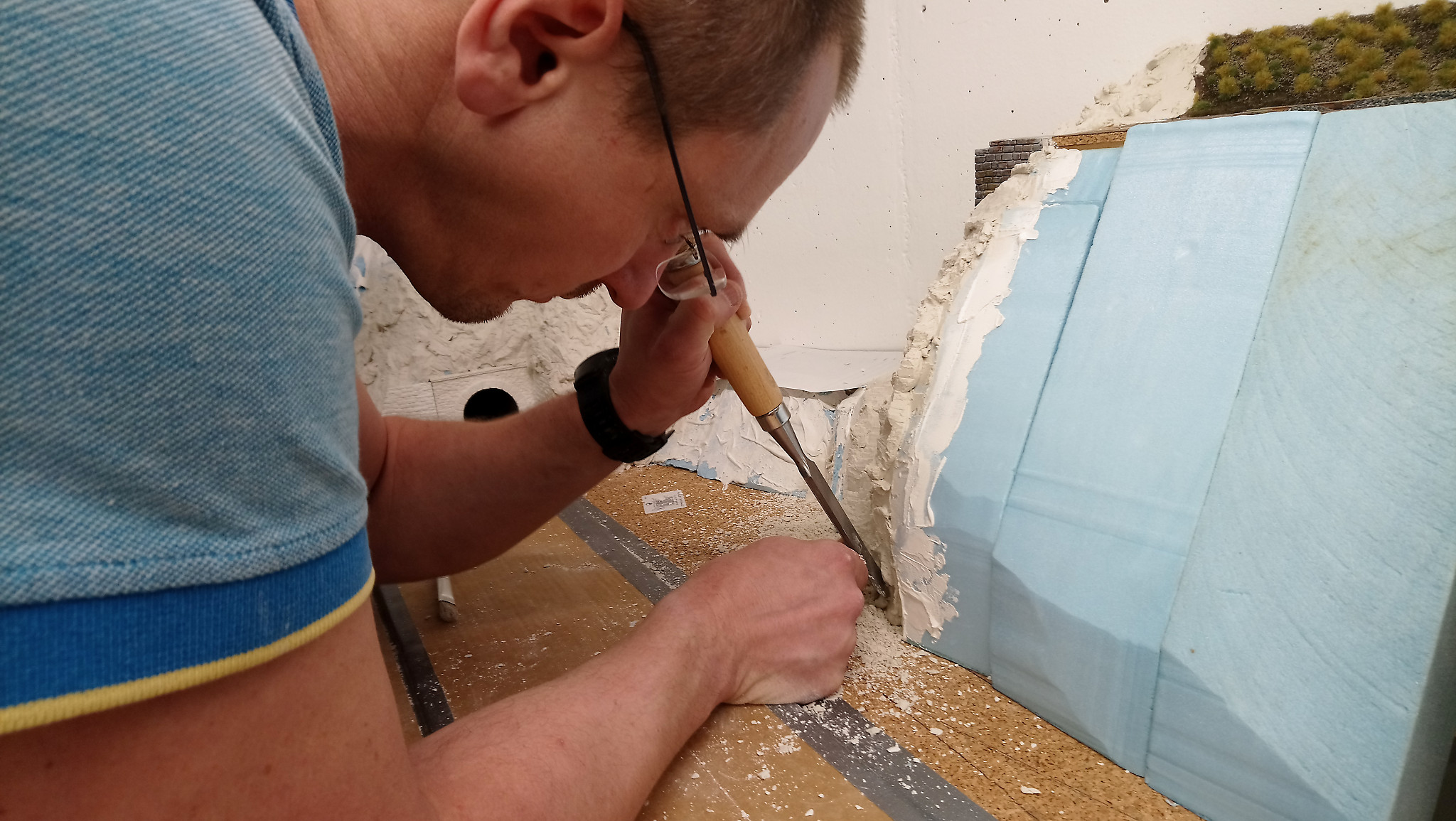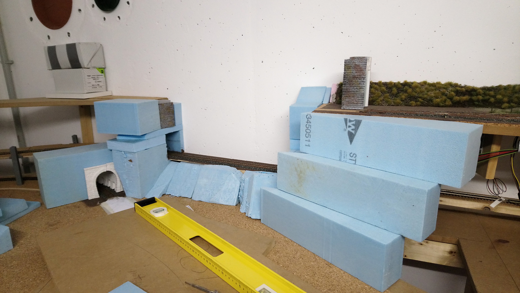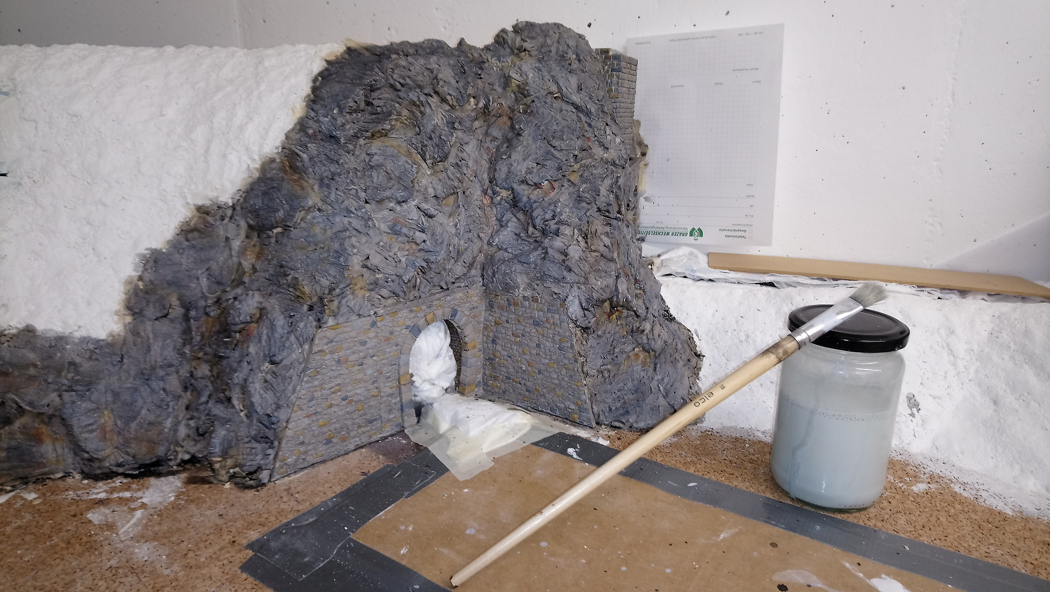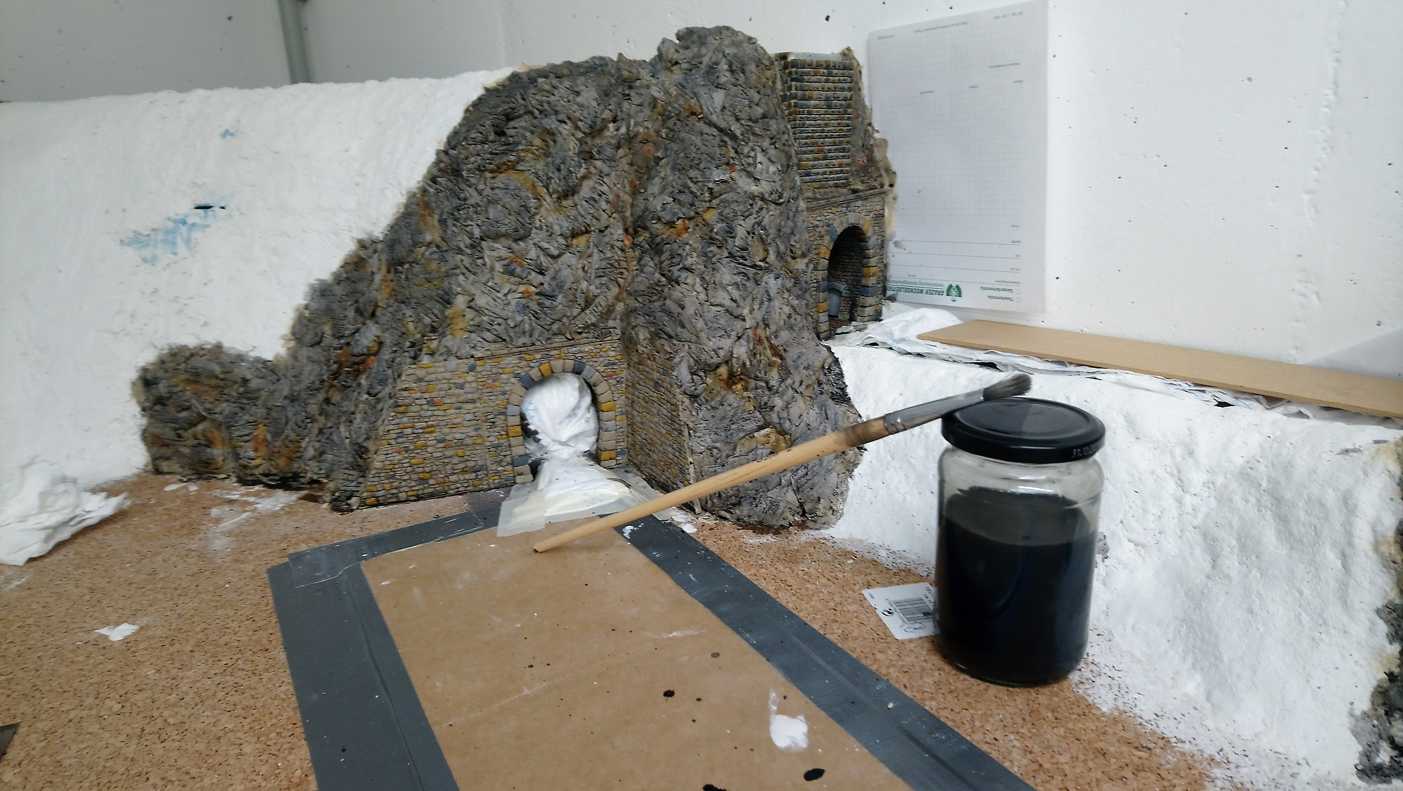 Nachdem alles gut duchgetrocknet ist, werden im nächsten Schritt noch Stützmauern und Tunnelportale eingebaut. Drei Portale, die ebenfalls aus Gips gemacht wurden haben wir direkt auf den Styrodur geklebt. Nach einer weiteren Trockenpause habe ich begonnen die Felsen mit Gips zu modellieren. Mit einem Stemmeisen habe ich die Struktur in den angezogenen aber noch nicht harten Gips geschnitten.