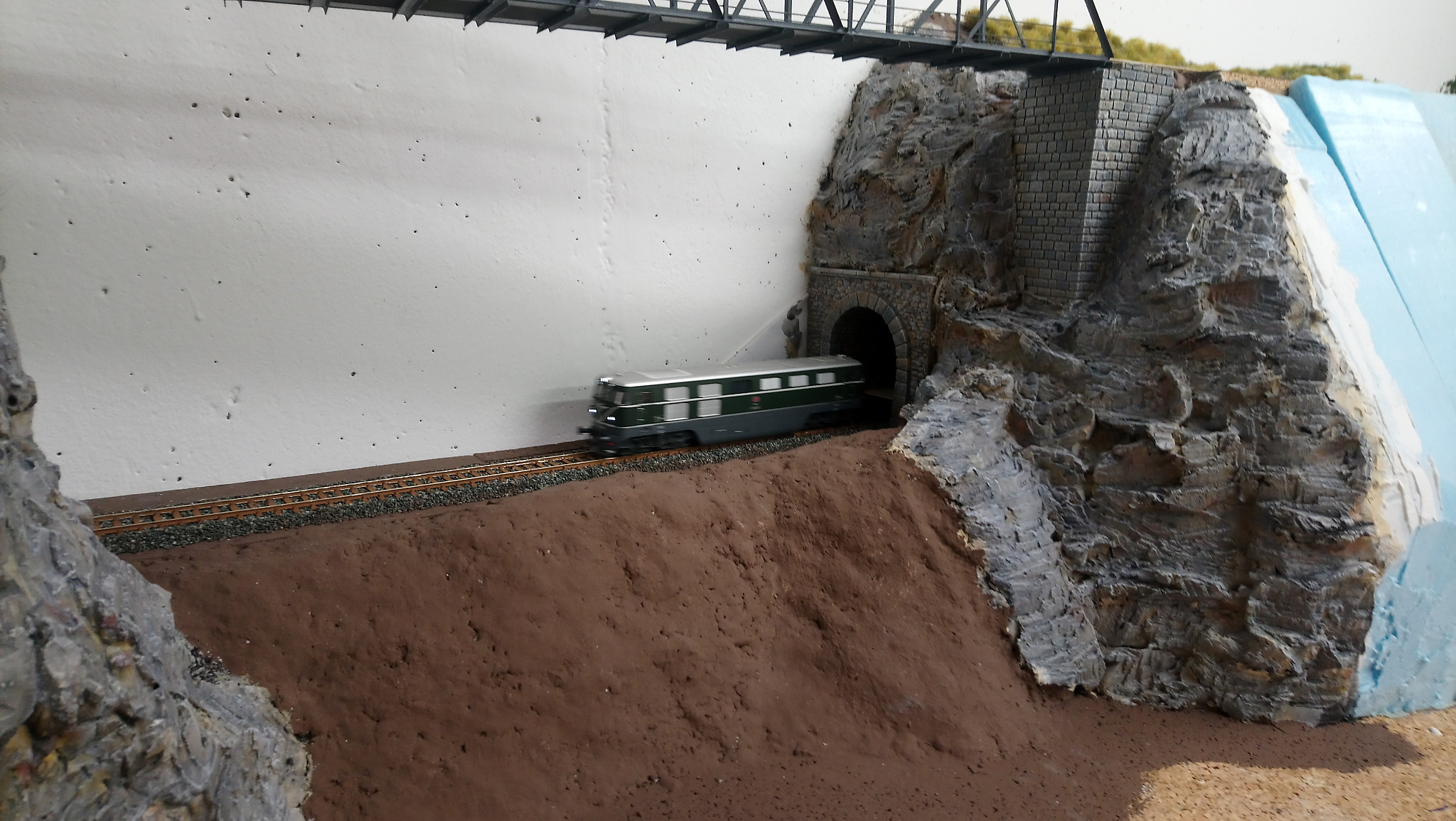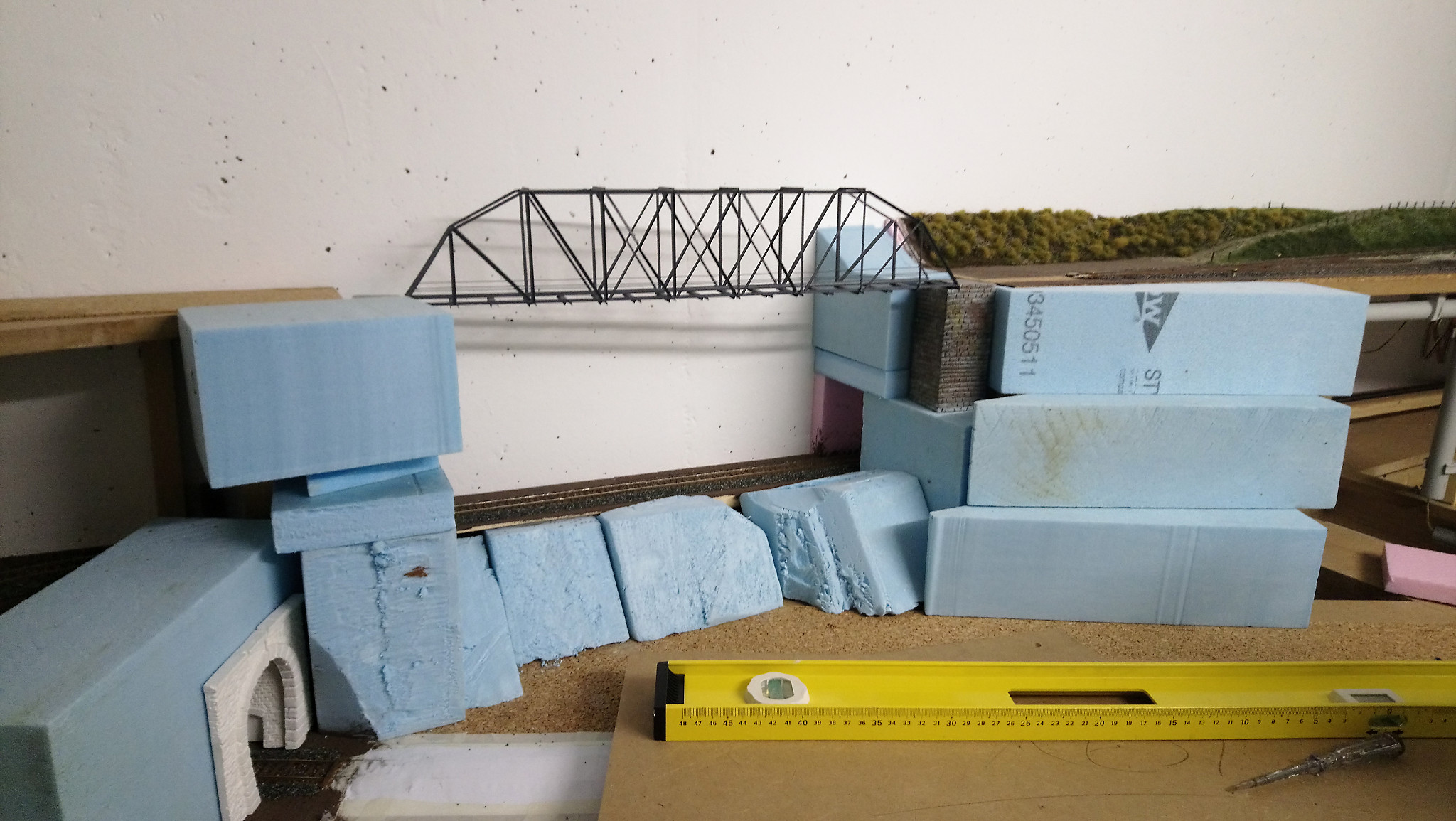 Auf dem Bild ist die Brücke vor dem Einbau. Die filigrane, aus Metall gefertigte Konstruktion passt hervorragend in die geplante Landschaft. Auf diesem Bild ist auch der Styrodurkern mit der Gipsummantelung zu sehen. Aber bevor sie eingebaut werden kann muss erst einmal die Landschaft darum herum entstehen. Die Trassenführung ist bereits gebaut. Jetzt heisst es die Lücken mit Syrodur zu schließen. In diesem bereicht fährt der Zug einmal unter der Brücke durch, und einmal daneben und etwas tiefer auf den Hauptbahnhof hinaus. das bedeutet das auch drei Tunnelportale integriert werden müssen. Das Gelände ist in diesem Bereich wegen Platzmangel auch recht steil was eine steile Felswand zur Folge hat.