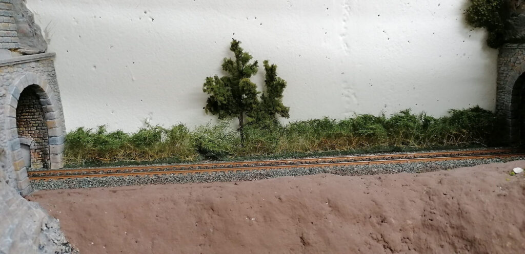 Nachdem die Überschwemmung gebannt war und alles gut durchgetrocknet war bekam der Untergrund noch Braune Farbe zur Grundierung verpasst und die erste Testfahrt konnte gemacht werden. Ein weiterer Separater Felsen entstand noch und dann wurde mit dem bepflanzen begonnen.