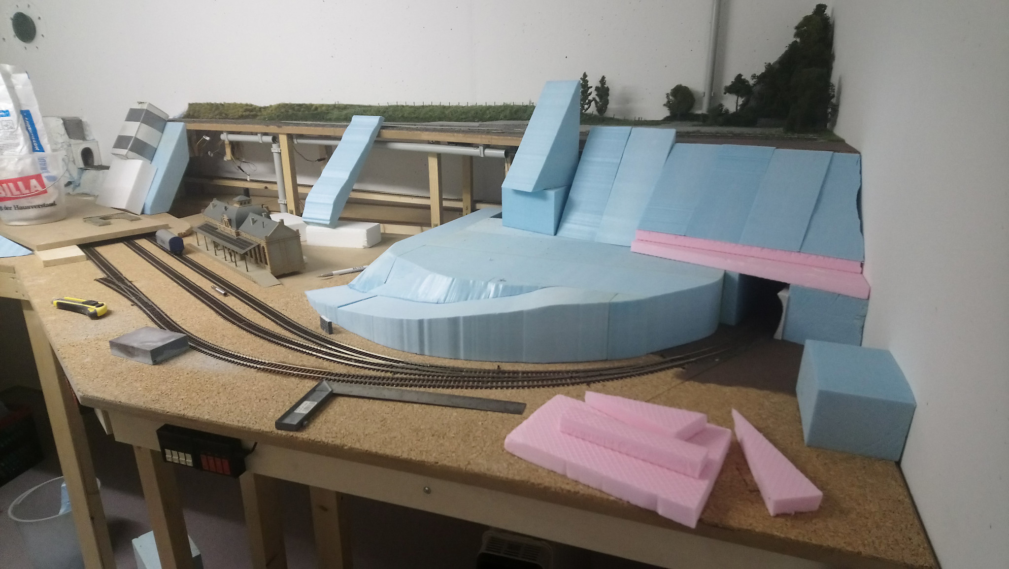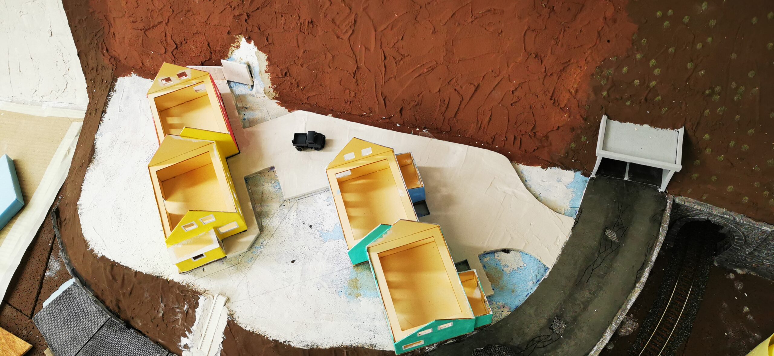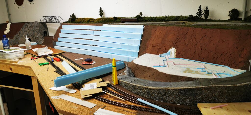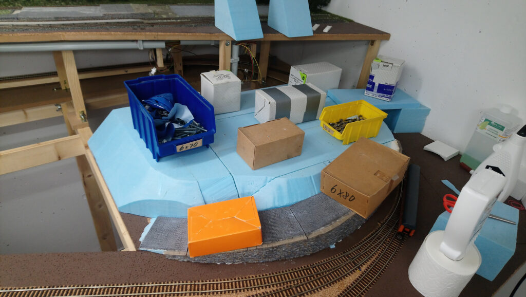 Zur Rechten vom Großen Hauptbahnhof wollten wir eine Zwischenebene einbauen um den Höhenunterschied zum Endbahnhof nicht so enorm wirken zu lassen. Die Idee Ein Hügel mit einem Plateau auf halber Höhe. Verschiedenen Ideen gingen uns durh den Kopf. Ein Gasthof oder ein Supermarkt. Wohnhäuser oder eine Fabrik. Einfach nur Wald mit einem Spielplatz…….