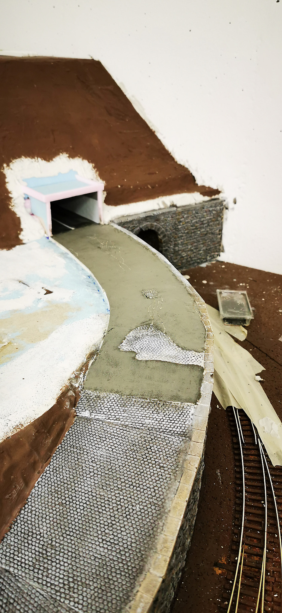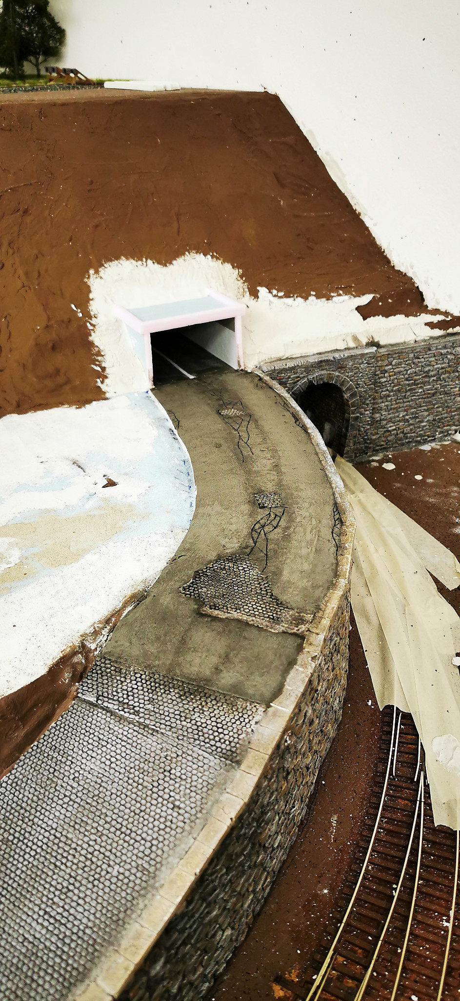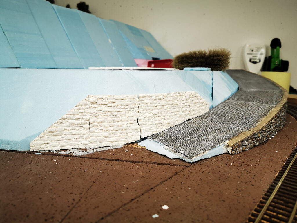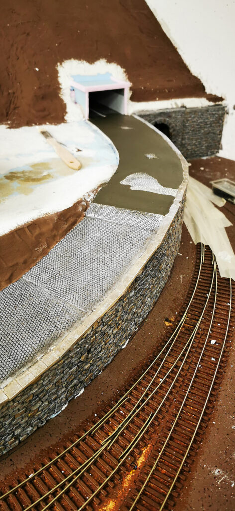 Nachdem die Straße und der Hügel fest an Ihrem Platz waren wurde alles miteinander integriert. Der Tunnel wurde eingebaut und die Mauer ergänzt. Im unteren Teil der Straße wurde die Böschung zu steil. Dort habe ich noch eine Stützmauer eingebaut. Da Sich der Hang an dieser Stelle aber schon zu setzen begonnen hat ist die Mauer schon etwas desolat und weist sprünge auf.