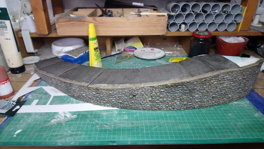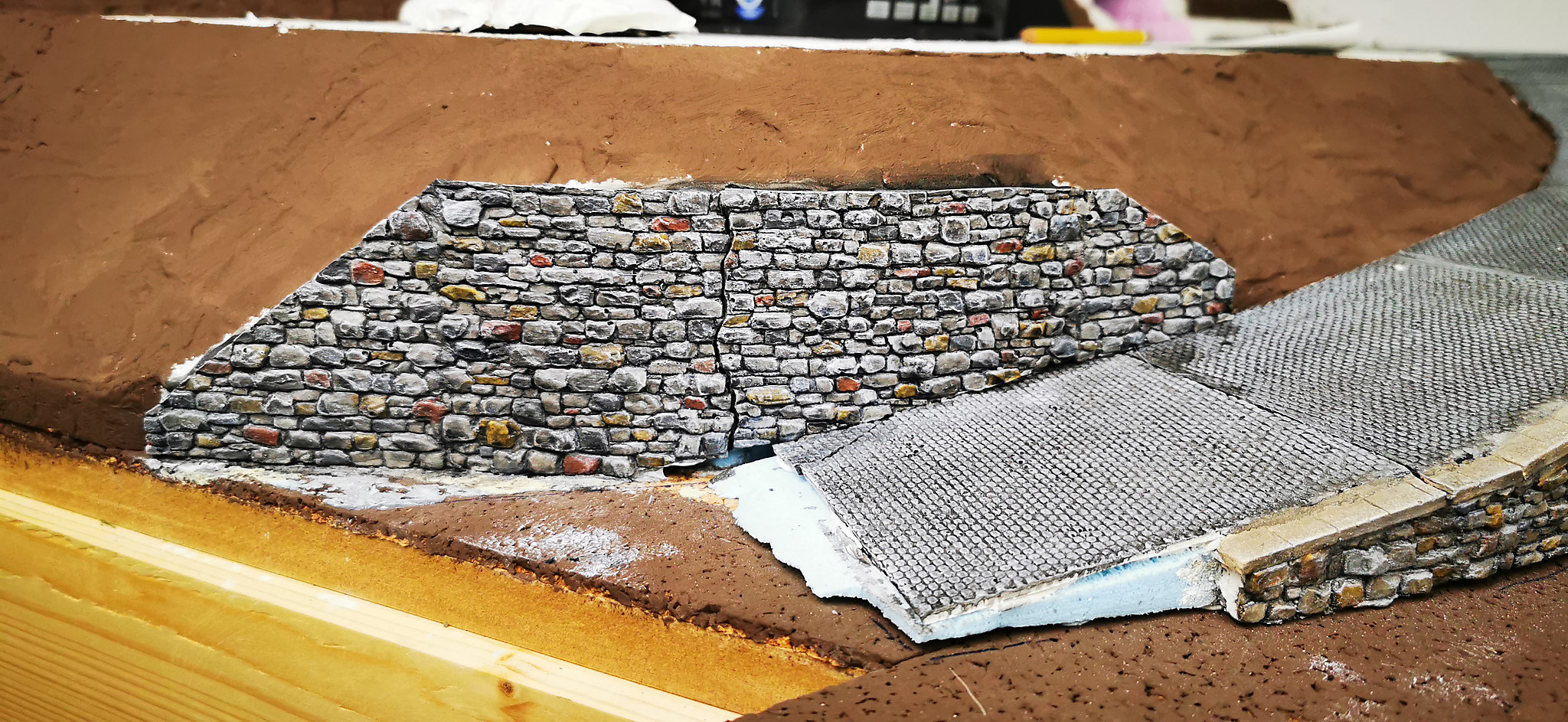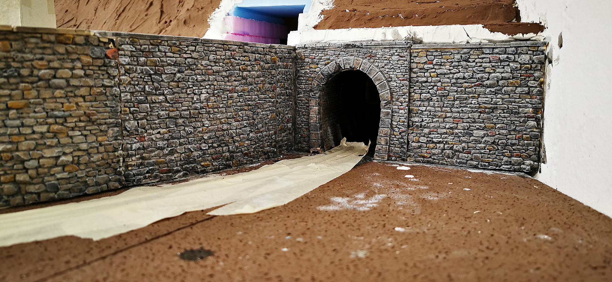 Nachdem die Straße und der Hügel fest an Ihrem Platz waren wurde alles miteinander integriert. Der Tunnel wurde eingebaut und die Mauer ergänzt. Im unteren Teil der Straße wurde die Böschung zu steil. Dort habe ich noch eine Stützmauer eingebaut. Da Sich der Hang an dieser Stelle aber schon zu setzen begonnen hat ist die Mauer schon etwas desolat und weist sprünge auf.