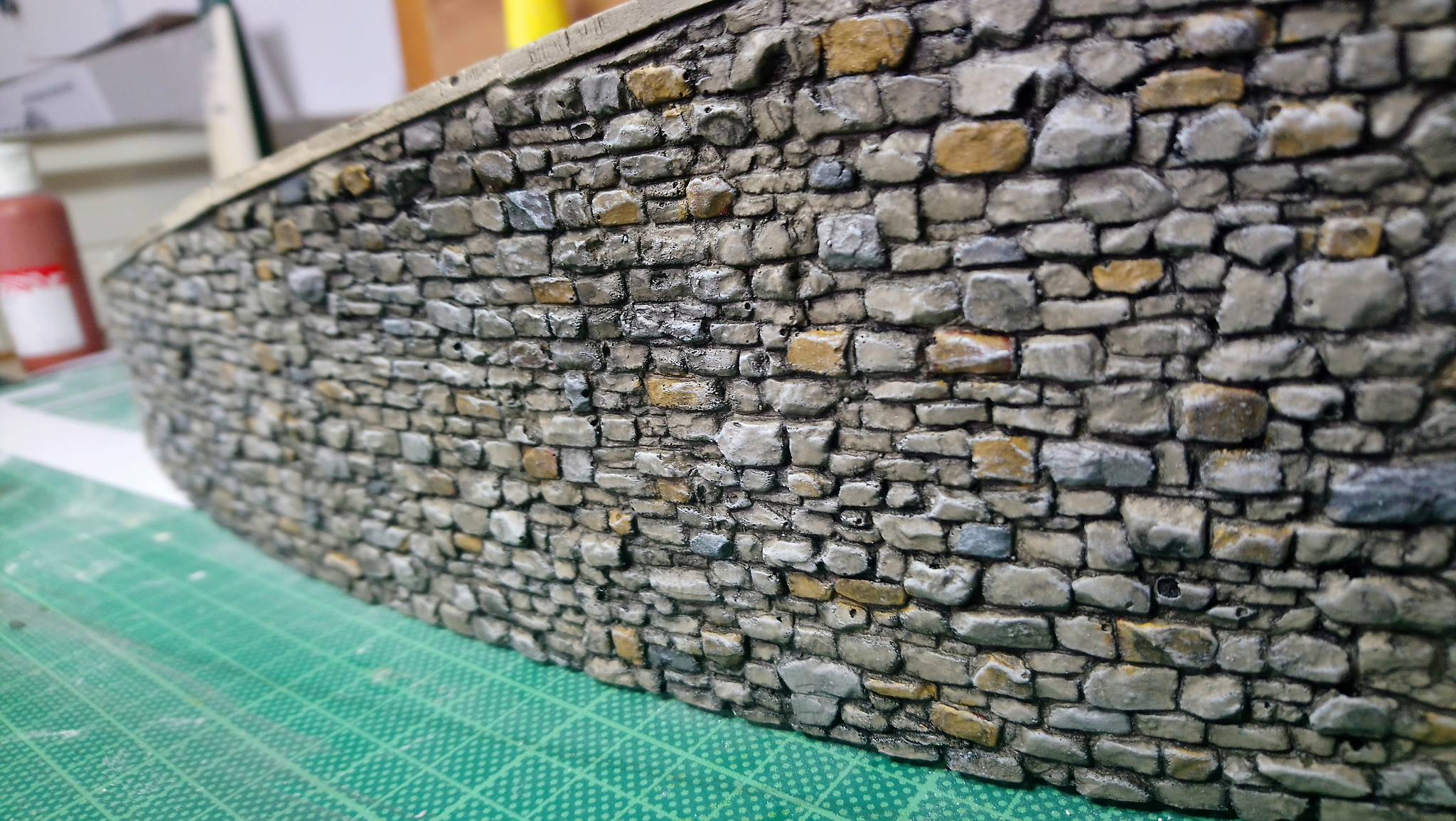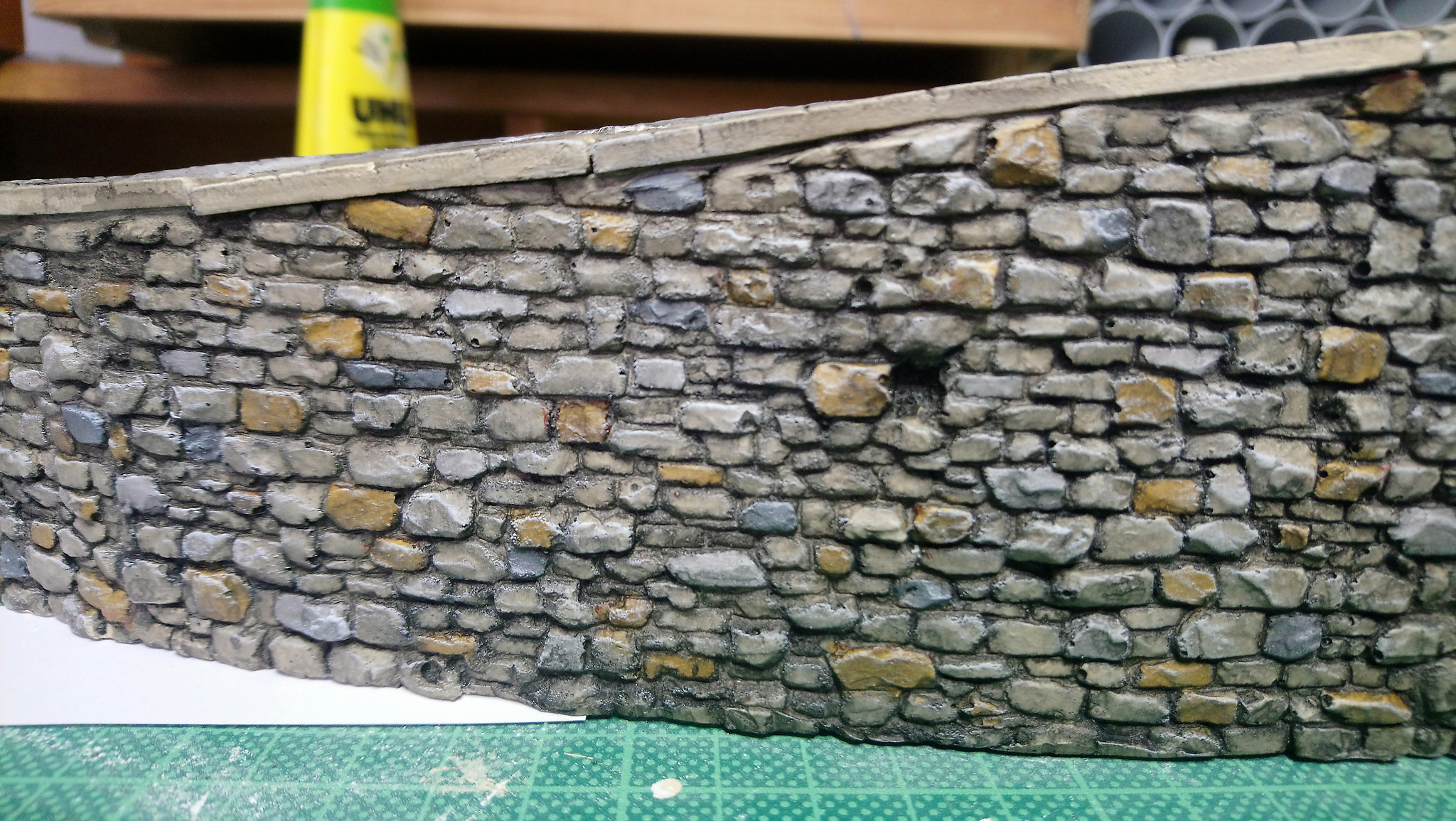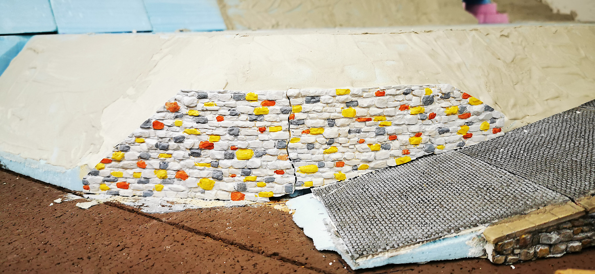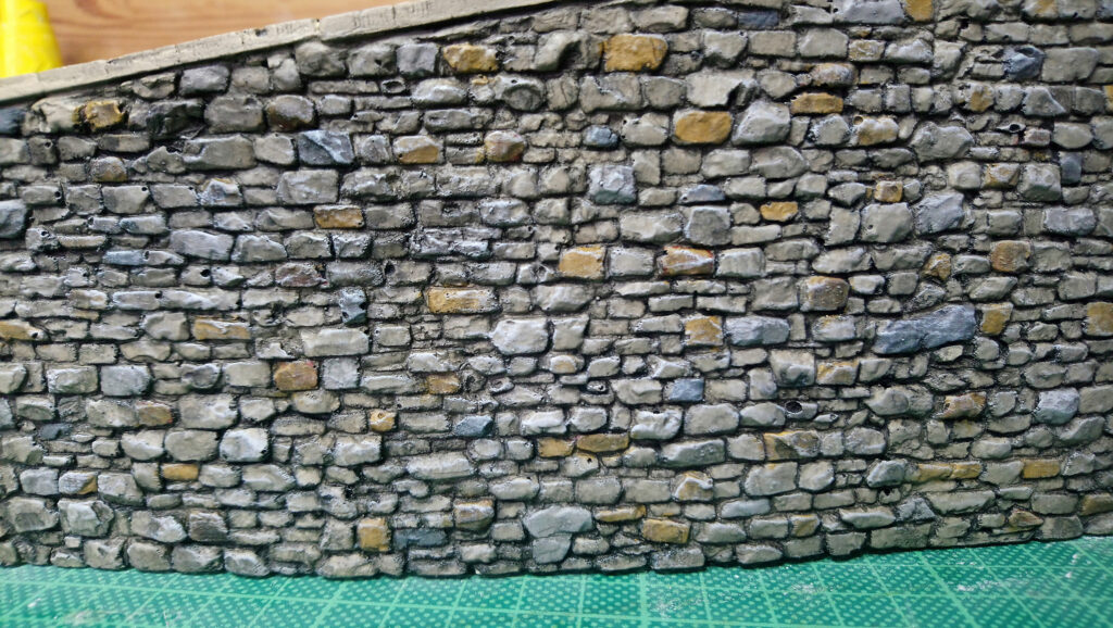Danach wurden zuerst die Mauern bebaut. Nach dem Aufkleben auf die Rampe wurden die Stöße verschlossen und gesäubert. Das Pflaster wurde danach zugeschnitten und verlegt. Im Unteren Bereich der Straße habe ich Wasserablaufrinnen eingeschnitten. Nach einer Ausgiebigen Trockenzeit und erster Stellprobe ging es dann ans bemahlen.