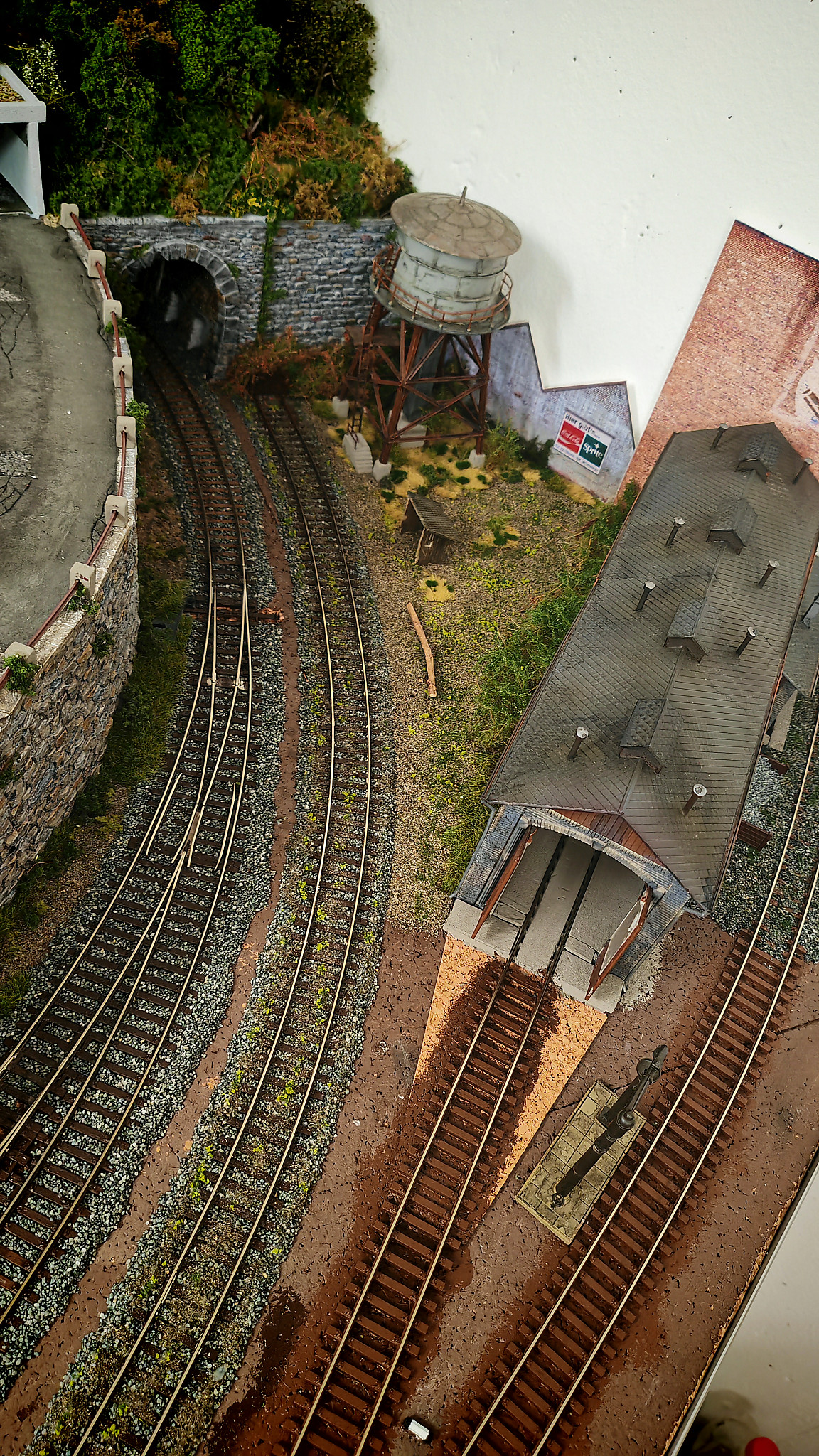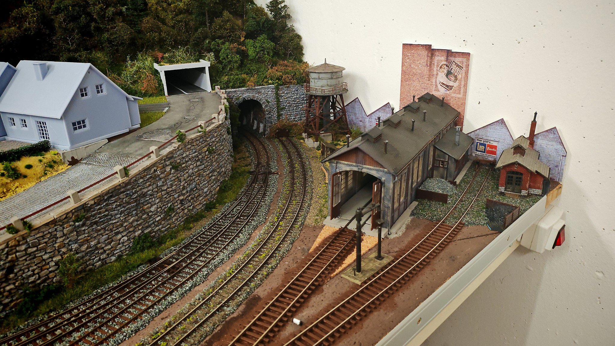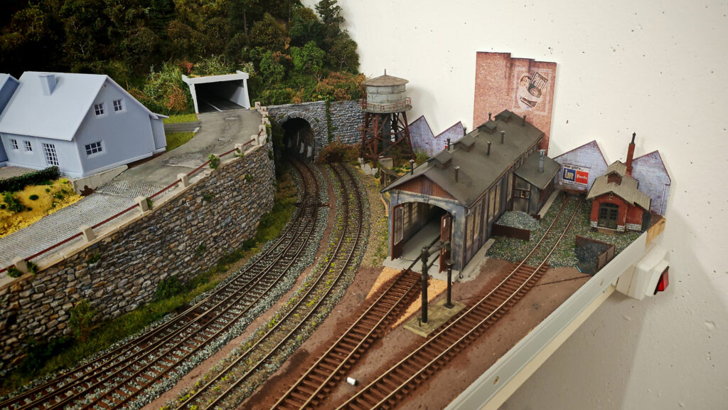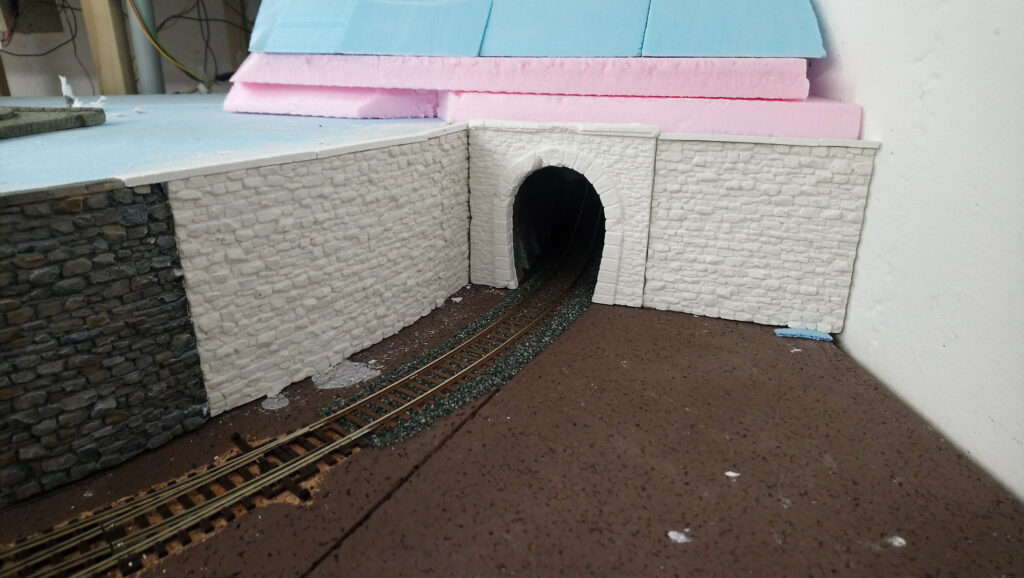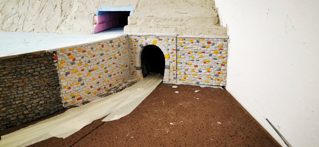 Die Mauer und das Tunnelportal ebenso die Stützmauer wurden in der üblichen Farbgebung bemahlt.