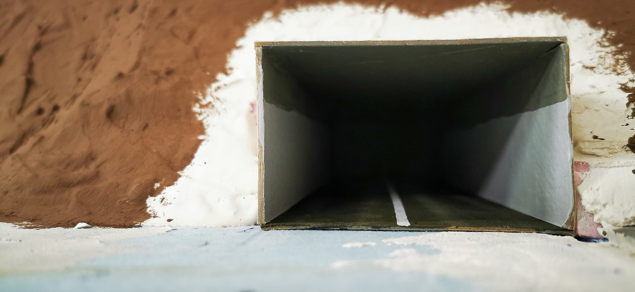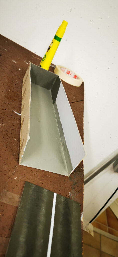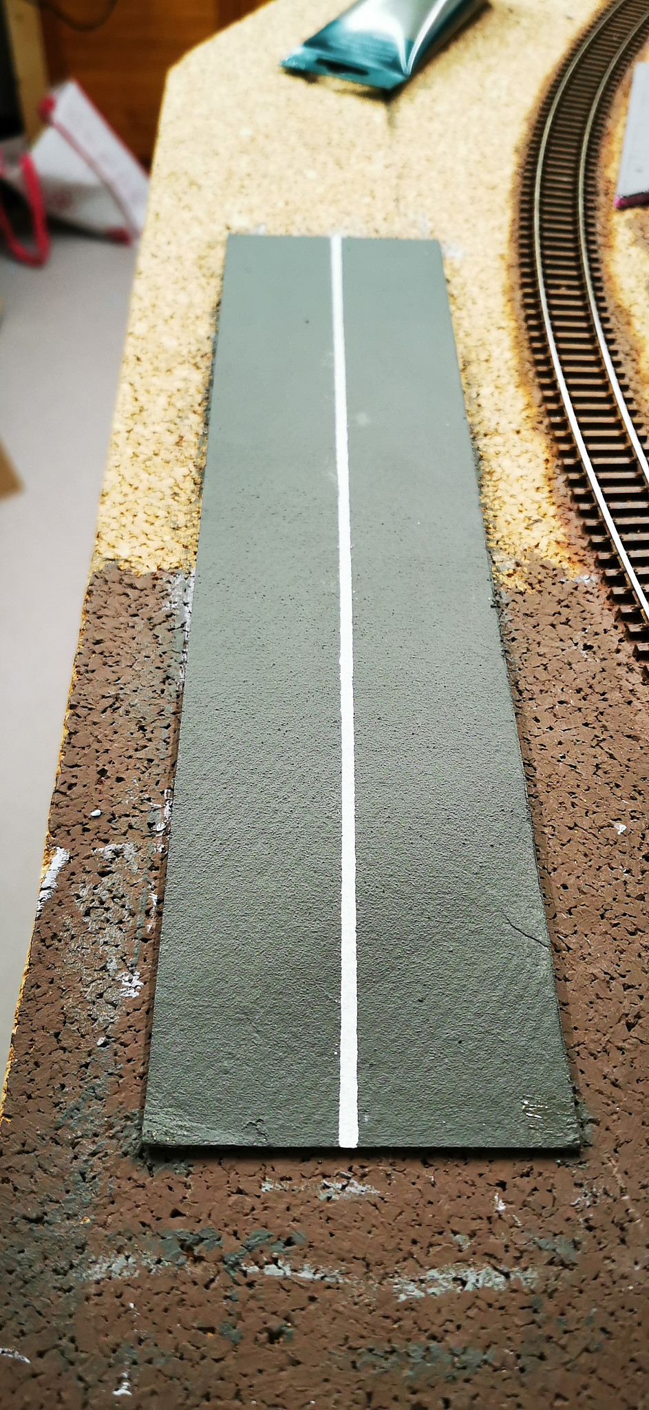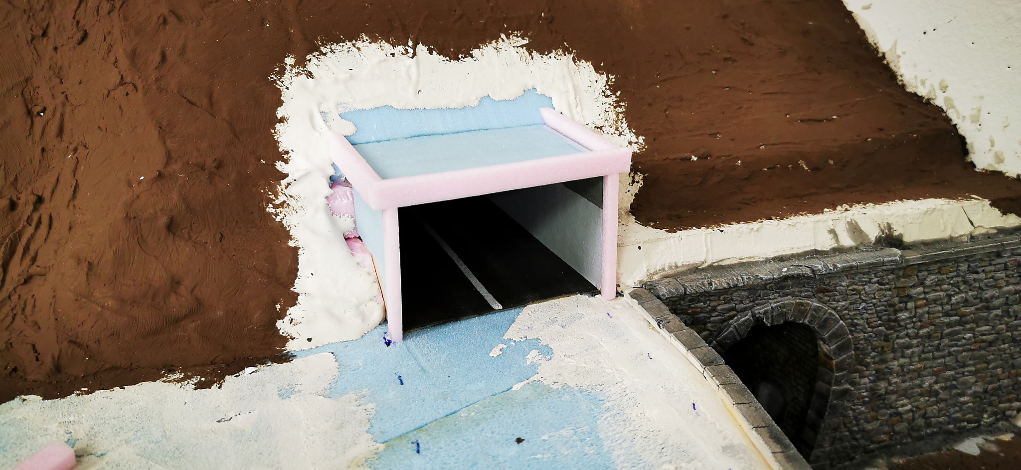 Jetzt ergab sich aber die Frage, ist es gerechtfertigt so eine mächtige Straße für vier Häuser zu bauen? Also wurde noch ein Straßentunnel gebaut. Ein Karton wurde zu einem U geformt und bemahlt. Die Straße ebenfalls aus einem Kartonstreifen grau bemahlt und eine weißer Trennstreifen gemahlt. Aus einem dünnen Styrodurstreifen wurde noch ein Tunnelportal gefertigt. das dann später noch begrühnt wird.