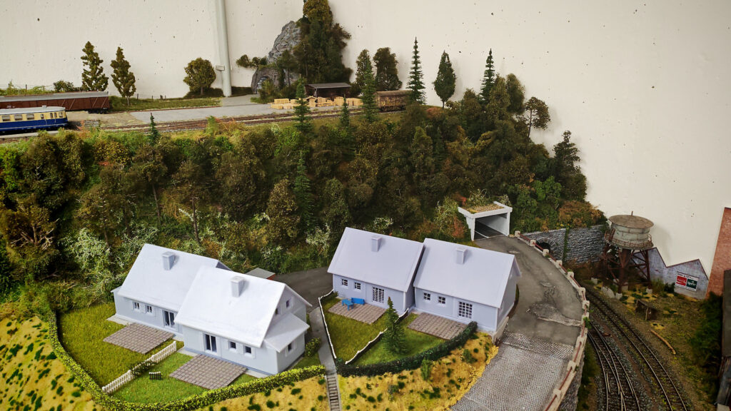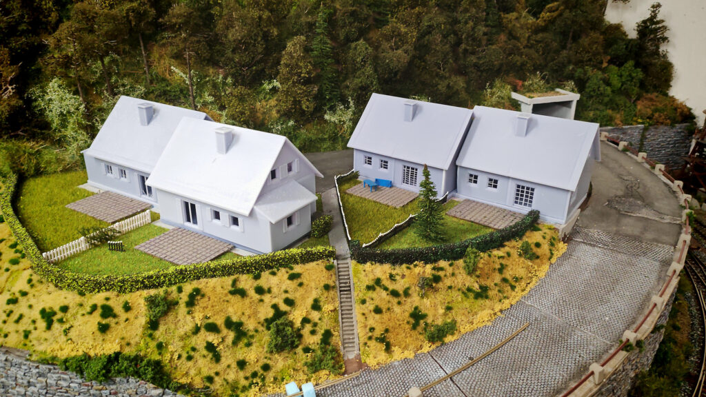 Die Terassen, Hecken und Rasen sind bereitz gepflanzt. Der Wald am Hang steht schon und der Tunnel ist auch bewachsen. Die Kartonhäuser sind bereits durch die neuen 3D Drucke ersetzt. Der Platz vor dem Bahntunnel ist ebenfalls schon gestaltet. Die Straße hat eine Leitschiene erhalten. Auch die Carports stehen schon. Jetzt brauchen nur noch die Häuser ihren Anstrich. Den Bau der Häuser habe ich hier gezeigt. „Die Reihenhäuser“