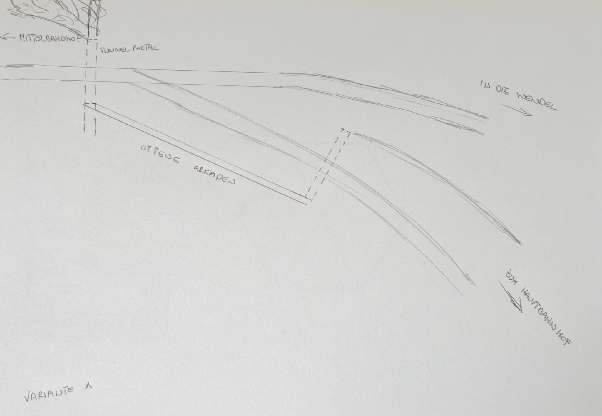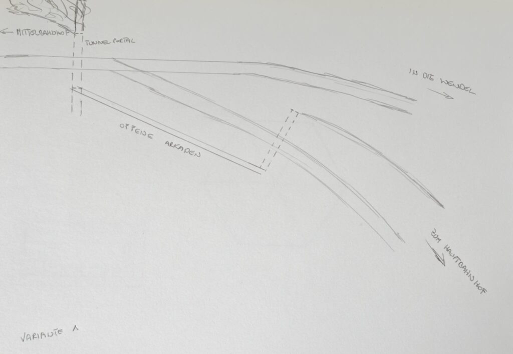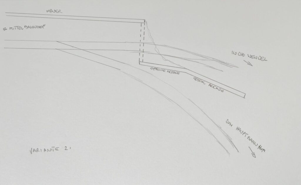 Von unserem Mittelbahnhof aus führt das Hauptgleis nach rechts zu einer Weiche von der aus man in die Wendel einfahren kann, oder weiter in Richtung Hauptbahnhof. Diese Weiche liegt sehr nah an der Wendel selbst. Die erste Idee war es Vor der Weiche ein Tunnelportal zu errichten und in Richtung Hauptbahnhof eine offene und geschlossene Arkadengallerie zu bauen.