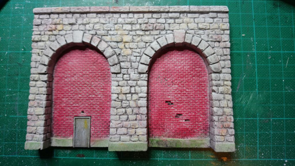 Nachdem alles verspachtelt ist, alle Fugen feschlossen, kann mit der Colorierung begonnen werden. Die Grundierung erfolgt wieder in einem Sandton. die Mauern werden wieder mit den unterschiedlichen Farben akzentuiert und dann bekommt alles moch eine ordentliche tönung mit mehreren Durchgängen an Washes.