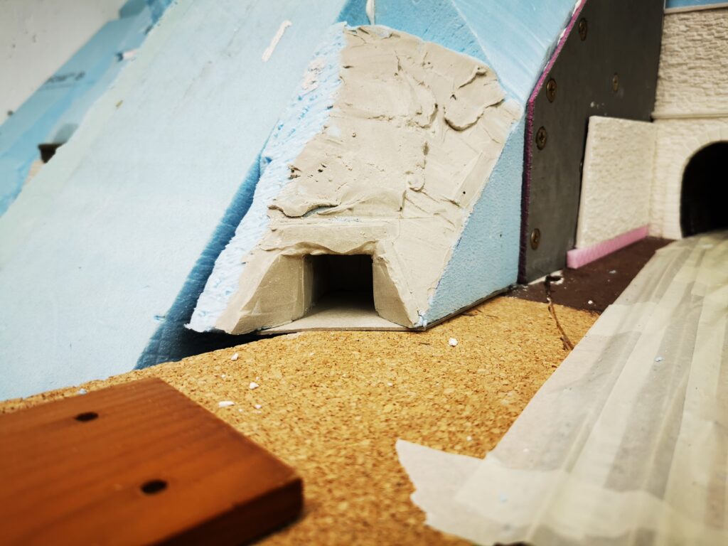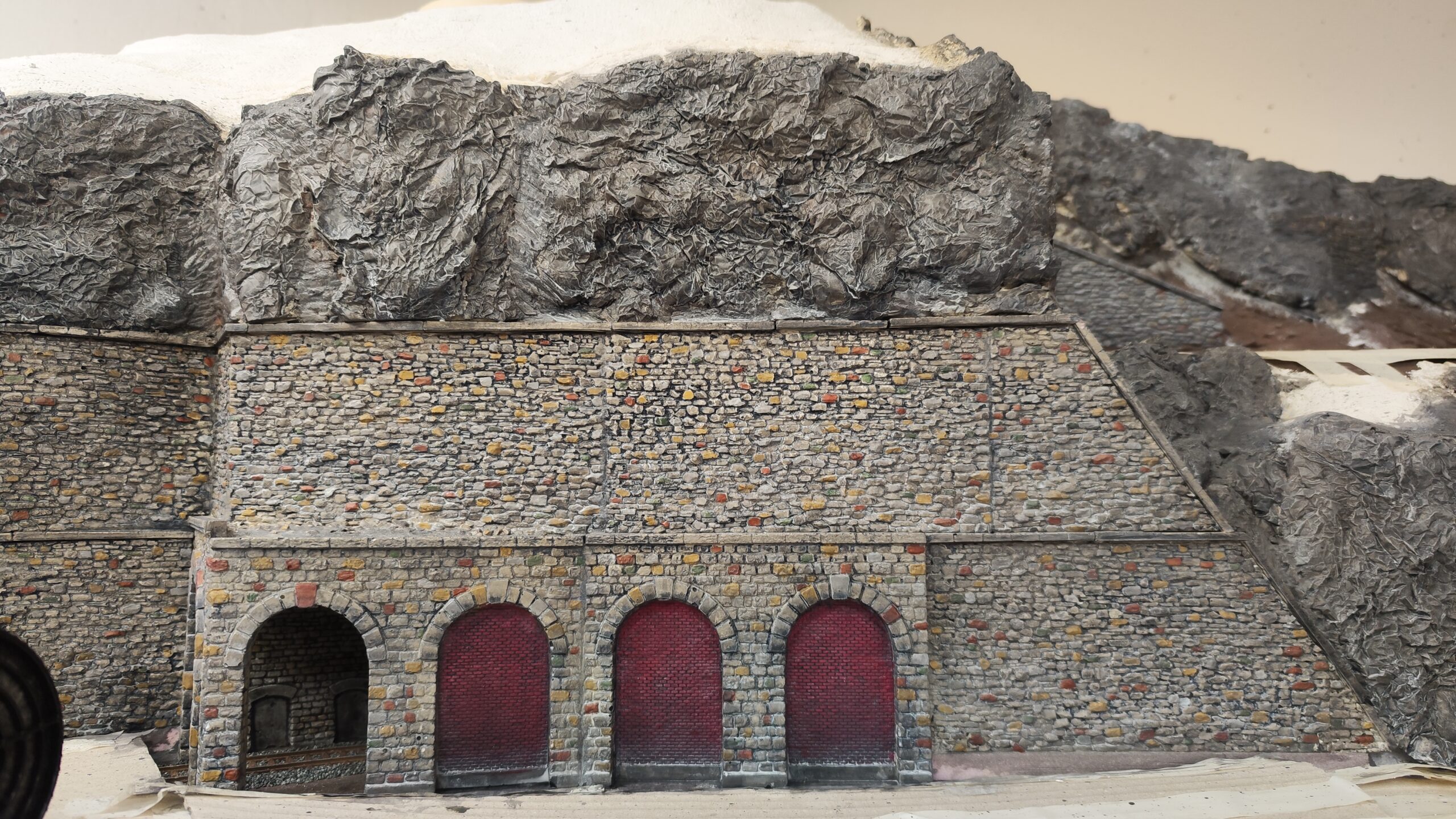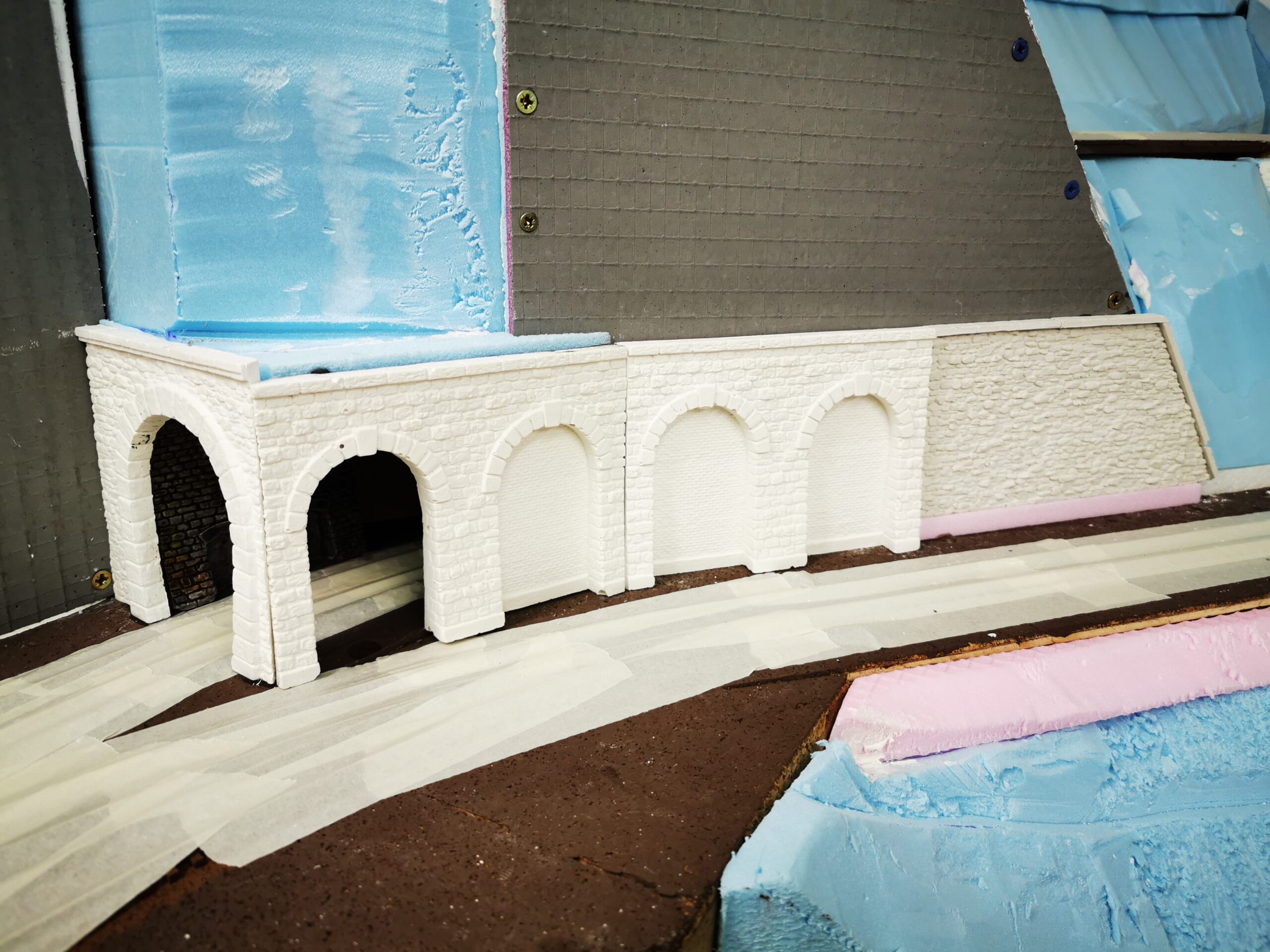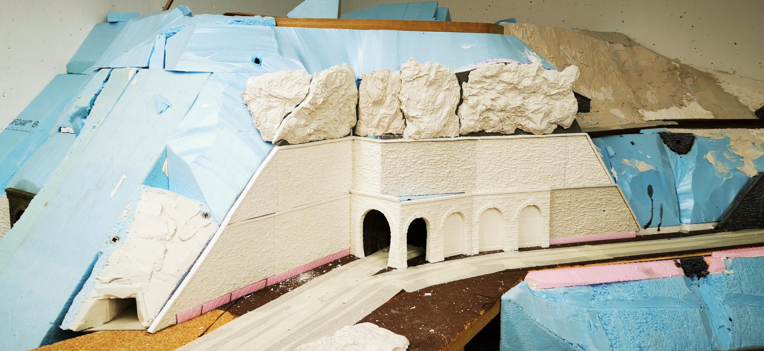 Als erstes haben wir den Tunnel gebaut der am Ende der Gallerie zum Hauptbahnhof führt. Dafür haben wir Aus Gips ein Portal geformt und an den Syrodur geklebt. Zur wendel hin haben wir eine Stützmauer gebaut die aus zwei mit Ziegel vermauerten Arkaden besteht. In die linke habe ich noch eine Tür zu einem Servicetunnel eingebaut.
