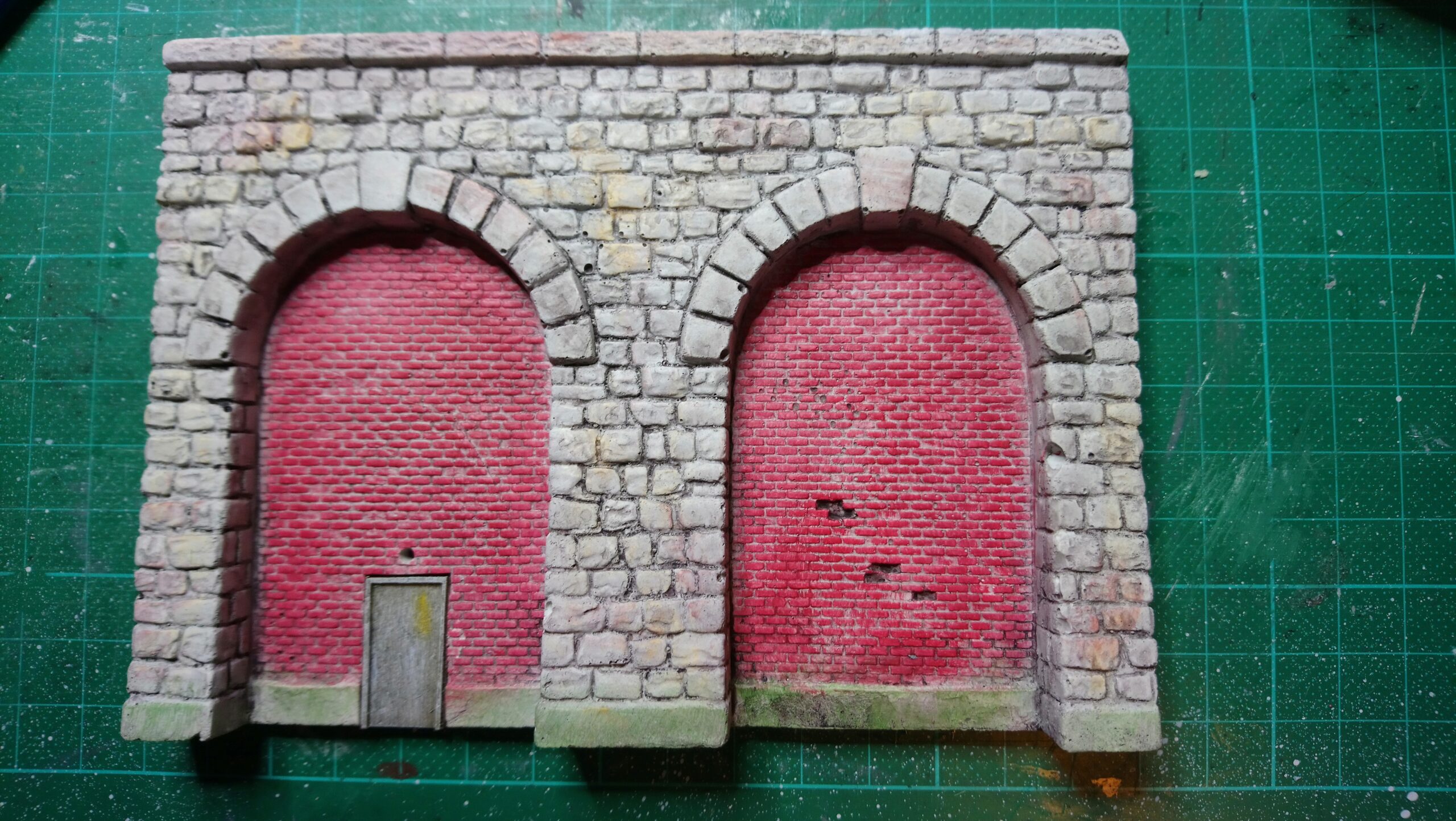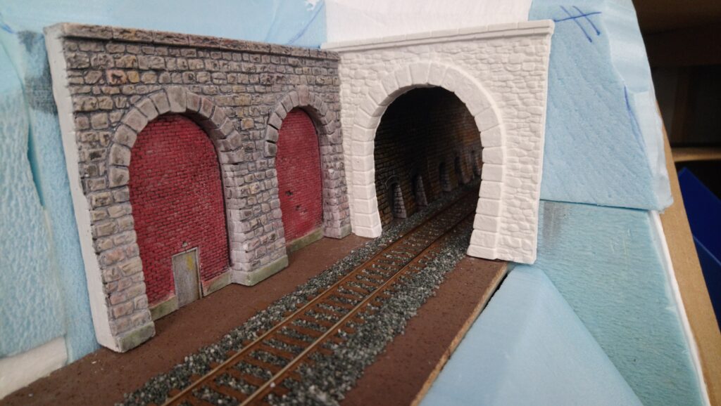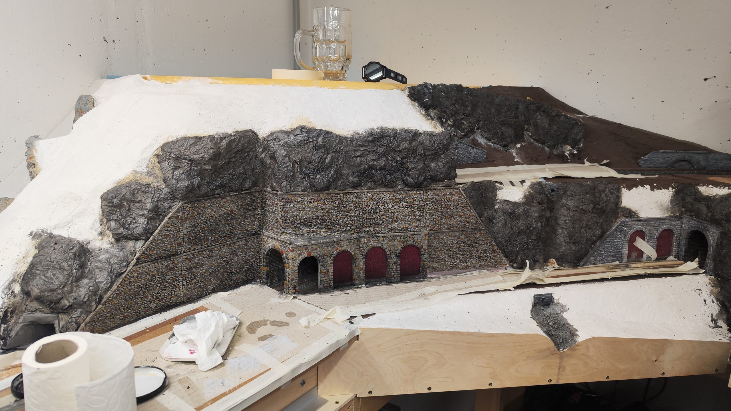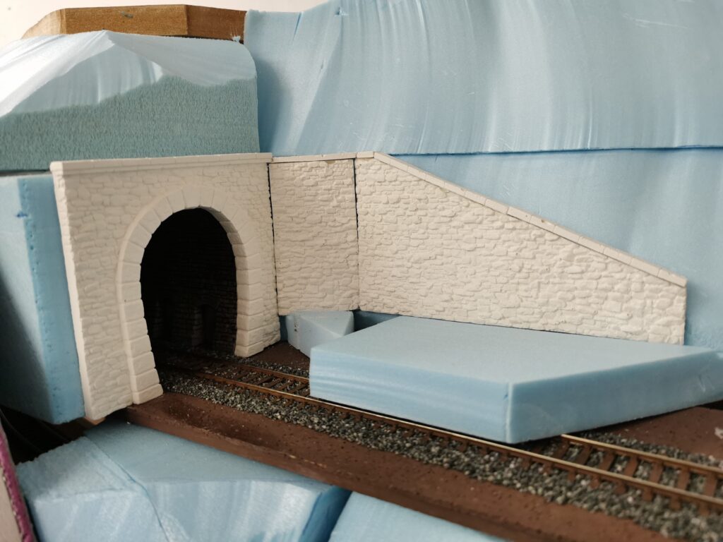 Als erstes haben wir den Tunnel gebaut der am Ende der Gallerie zum Hauptbahnhof führt. Dafür haben wir Aus Gips ein Portal geformt und an den Syrodur geklebt. Zur wendel hin haben wir eine Stützmauer gebaut die aus zwei mit Ziegel vermauerten Arkaden besteht. In die linke habe ich noch eine Tür zu einem Servicetunnel eingebaut.