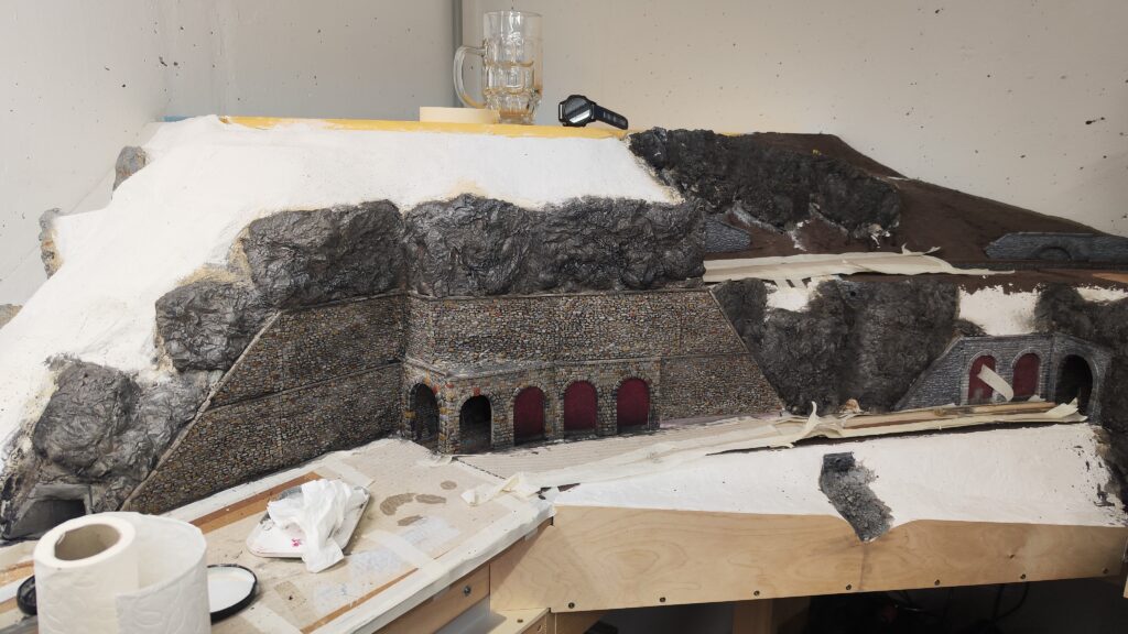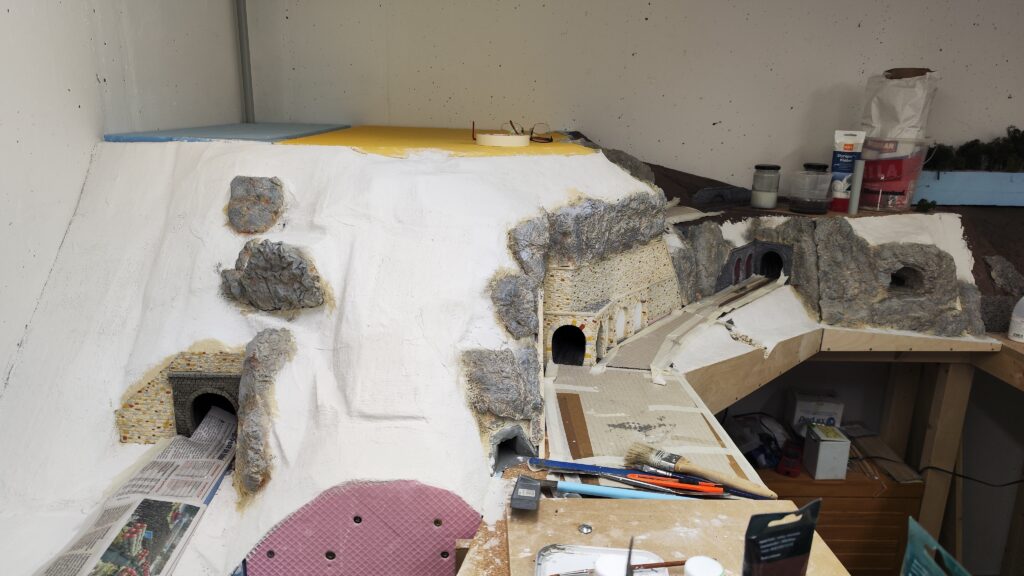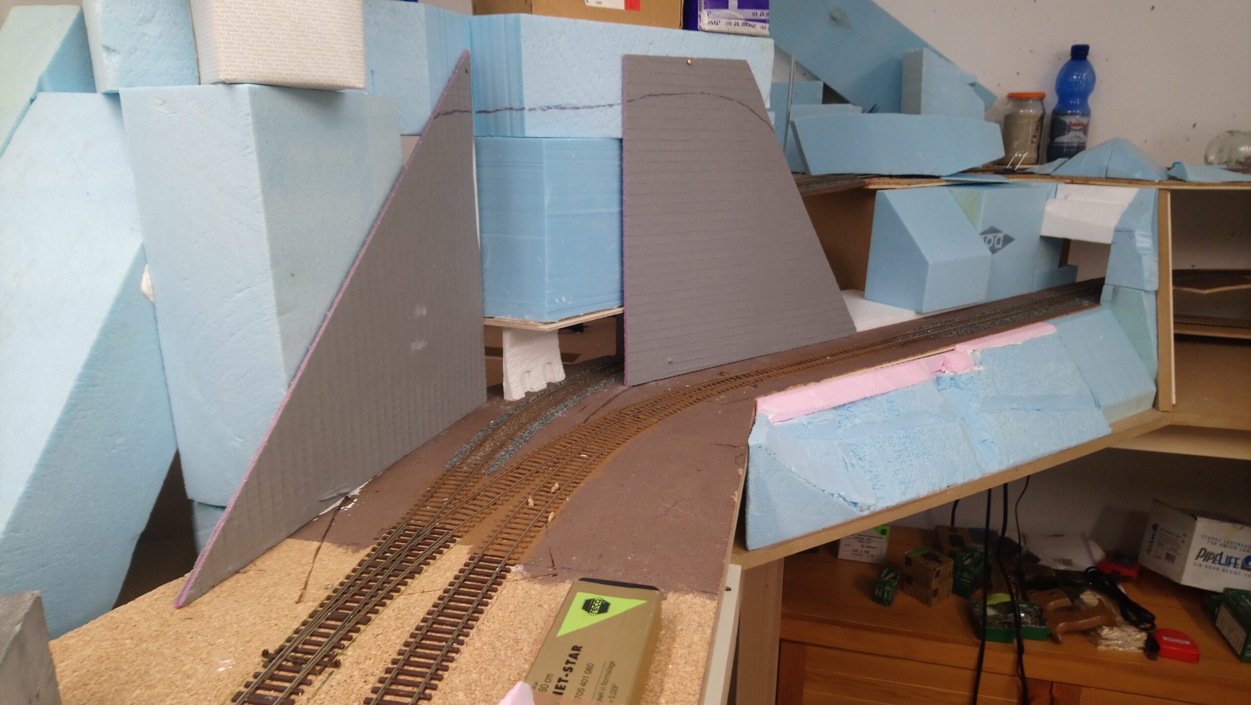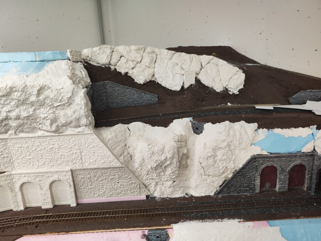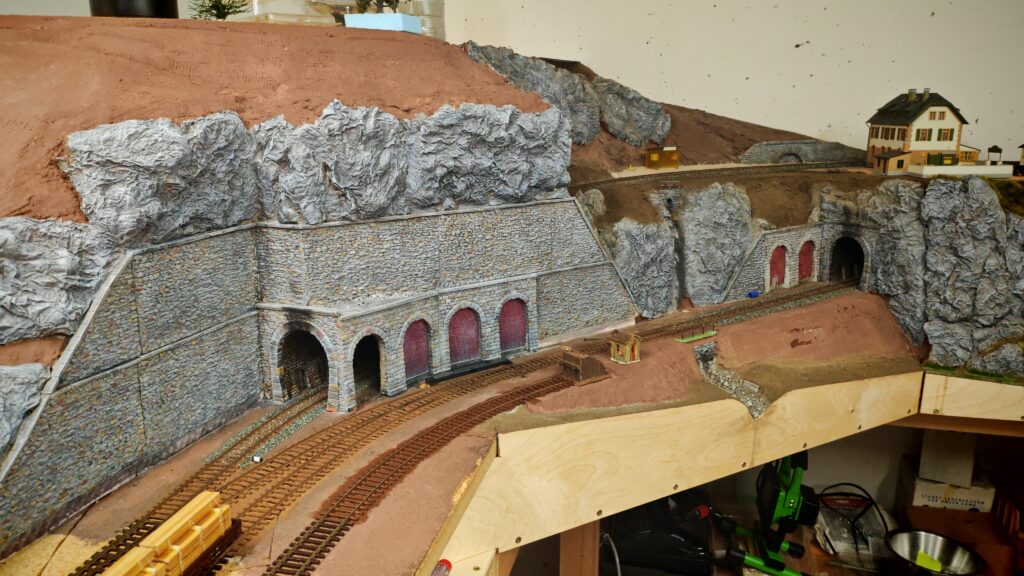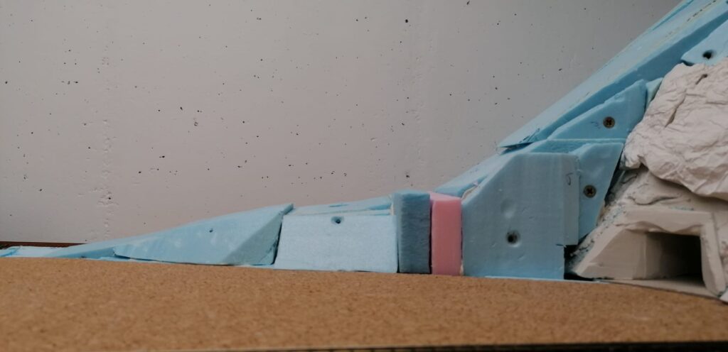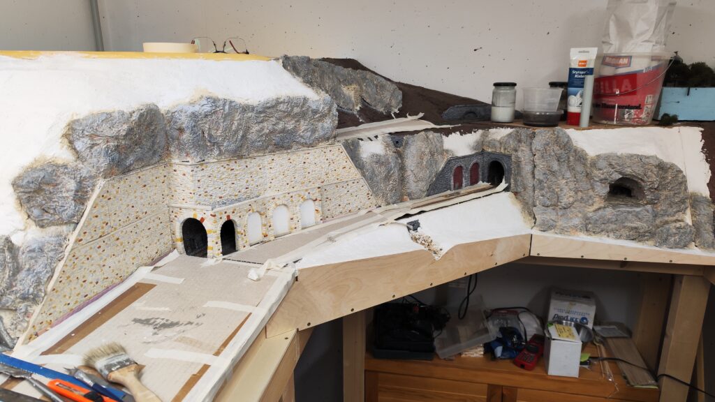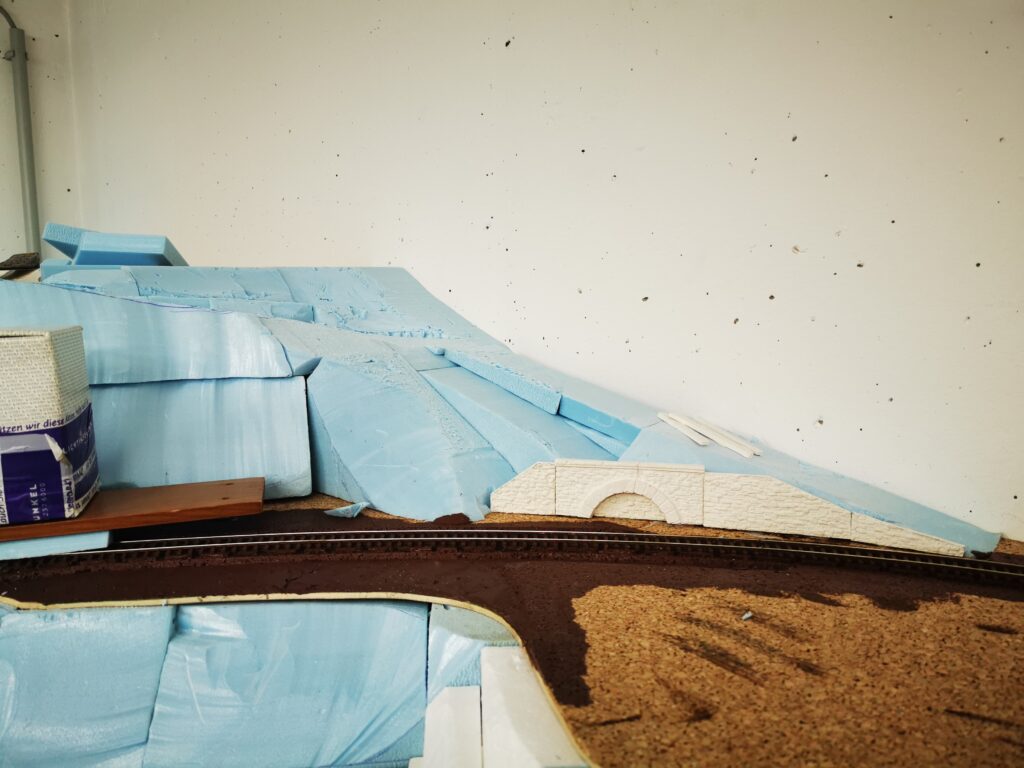 In weiterer Folge haben wir uns für eine Variante entschieden bei der die Weich frei zugänglich bleibt. Dadurch endsteht allerdiengs eine gewaltige senkrechte Wand direkt an der Wendel. Die muss jetzt verbaut werden.