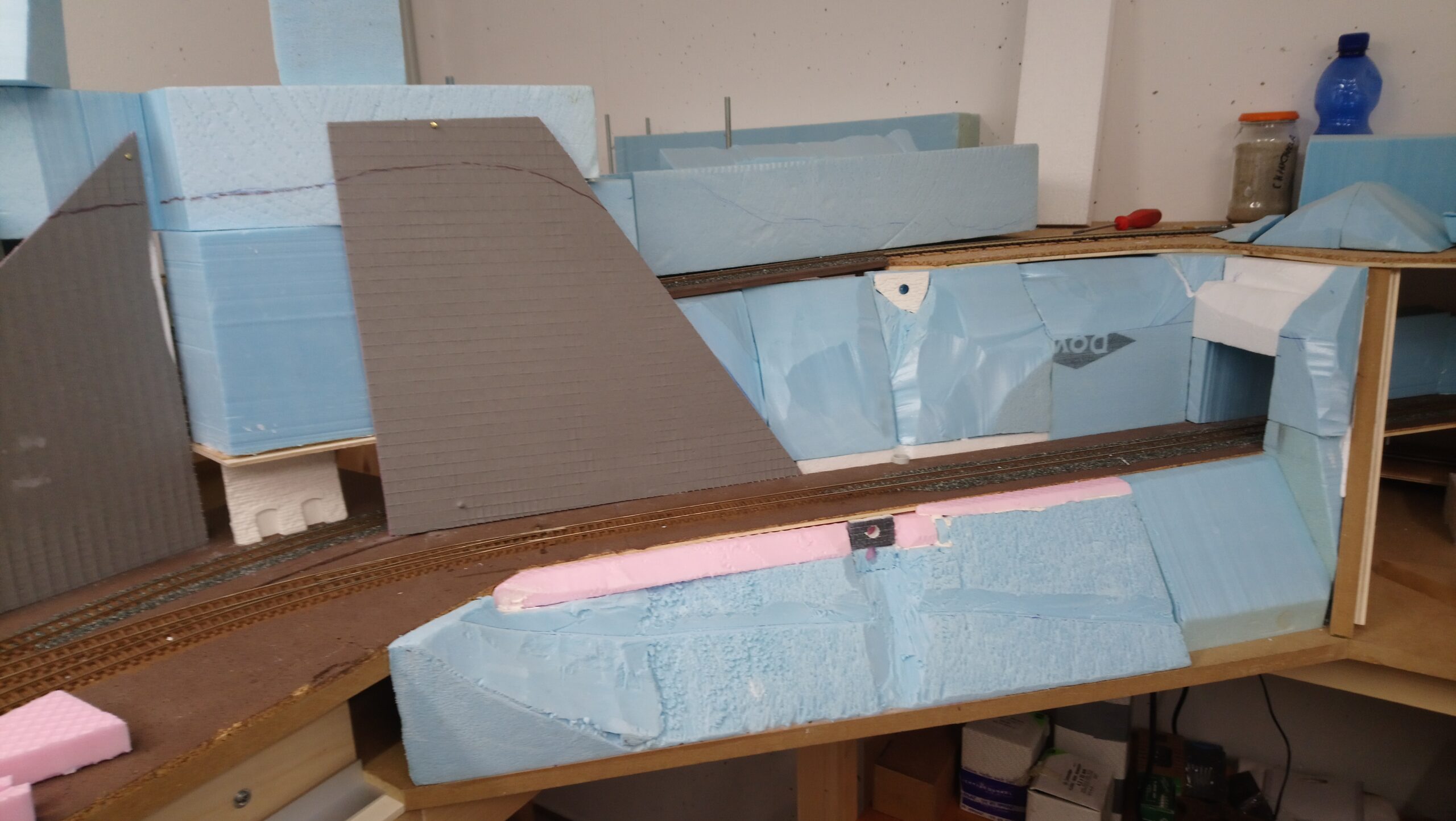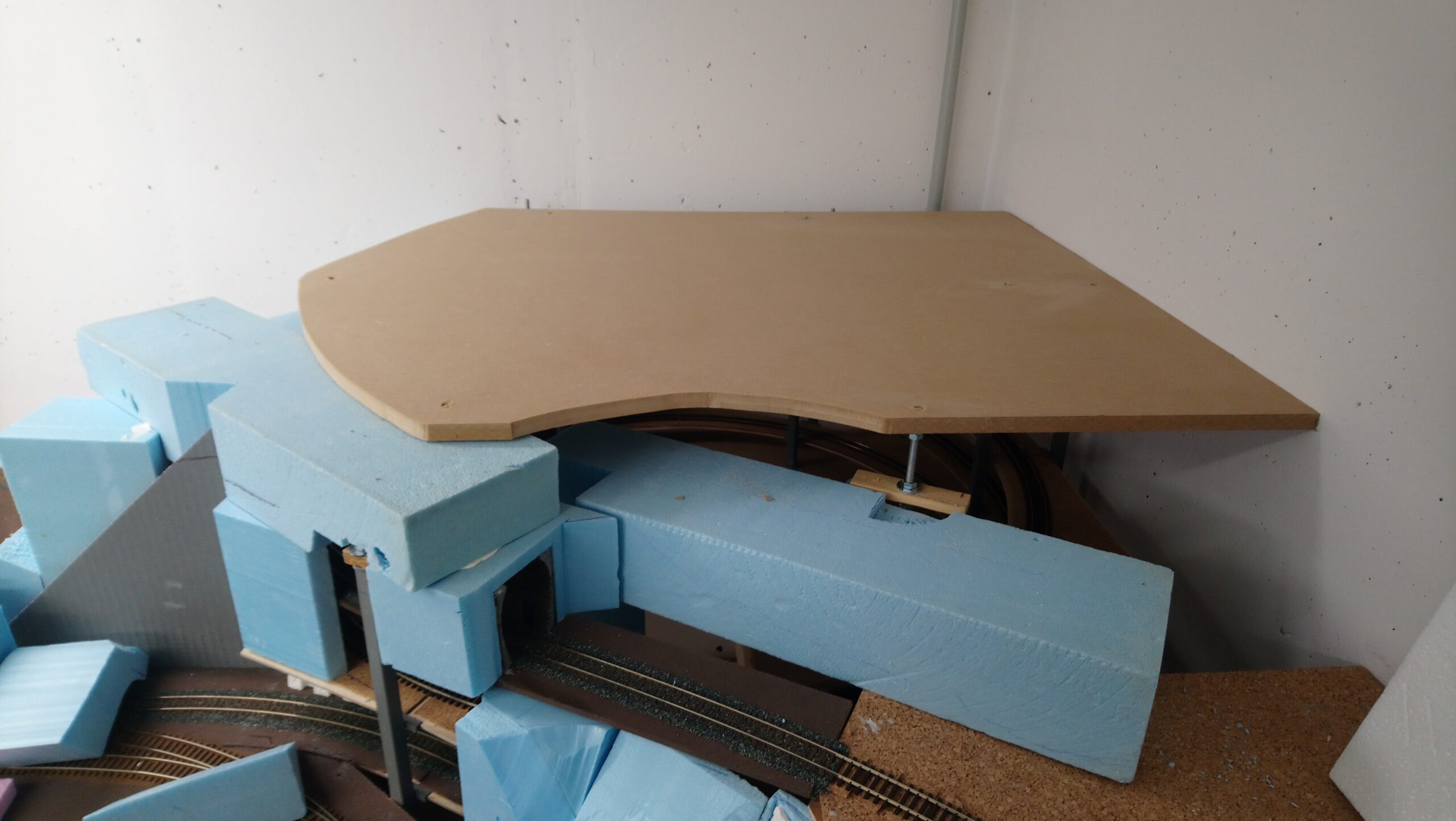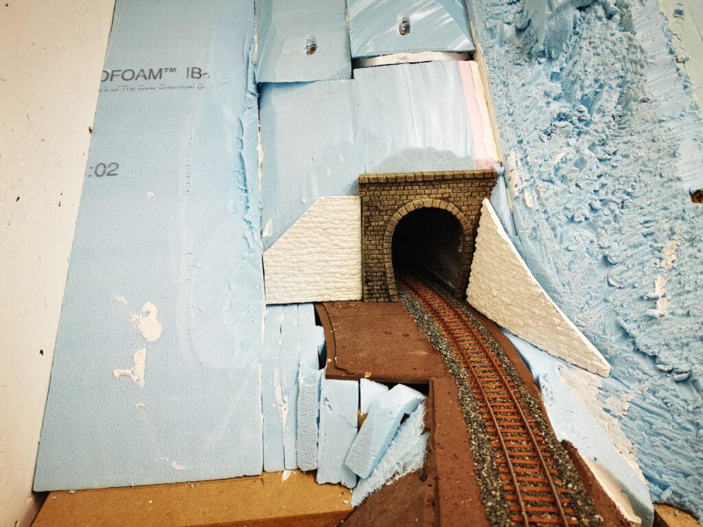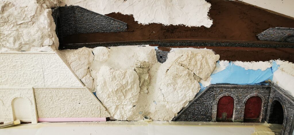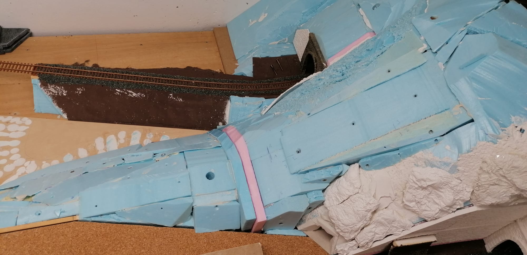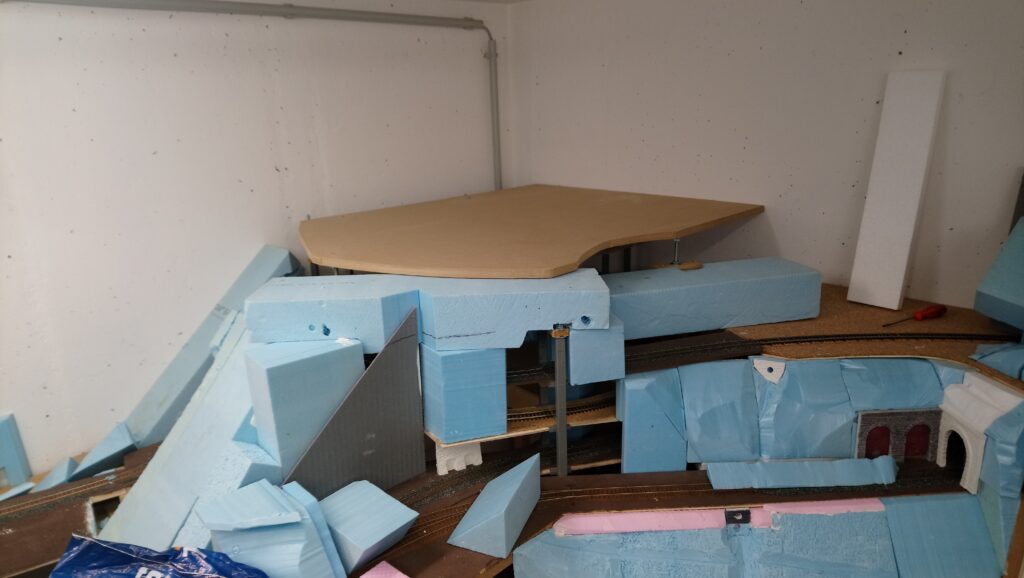 In weiterer Folge haben wir uns für eine Variante entschieden bei der die Weich frei zugänglich bleibt. Dadurch endsteht allerdiengs eine gewaltige senkrechte Wand direkt an der Wendel. Die muss jetzt verbaut werden.